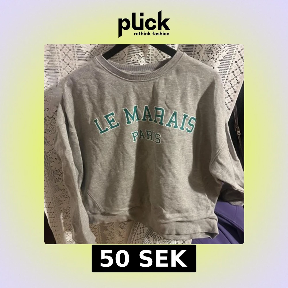 Säljer en grå sweatshirt med texten 'LE MARAIS PARIS' i turkos. Tröjan har långa ärmar och en rund halsringning. Perfekt för en avslappnad stil.