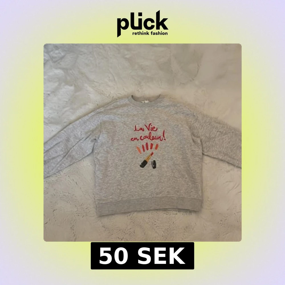 Grå sweatshirt från H&M med rött tryck på bröstet där det står 'La Vie en couleur!' och motiv av läppstift. Tröjan har rund halsringning och långa ärmar. Perfekt för en avslappnad och trendig look.