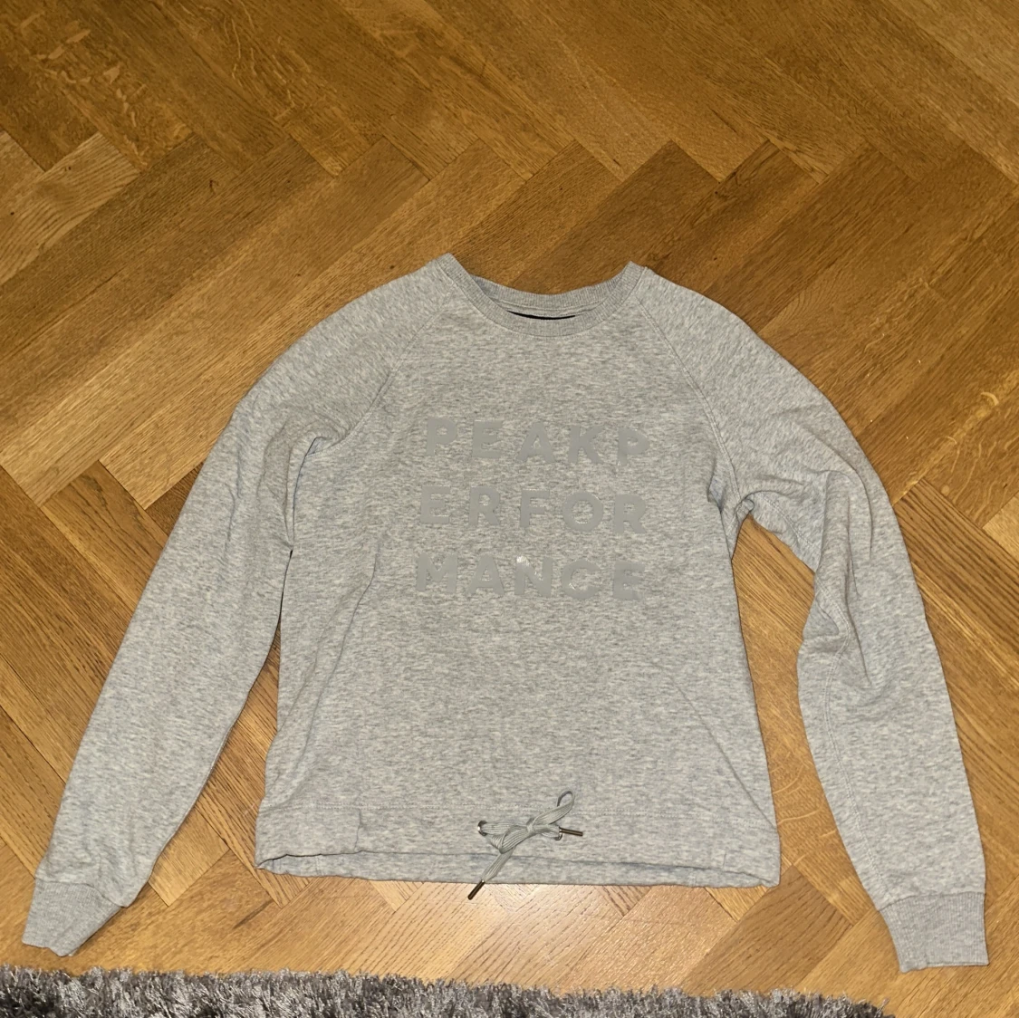Säljer en grå sweatshirt från Peak Performance i storlek XS. Tröjan har tryckt logga framtill, långa ärmar och ribbade muddar. Nedtill finns en snörning för justerbar passform. Perfekt för en chill och sportig stil.