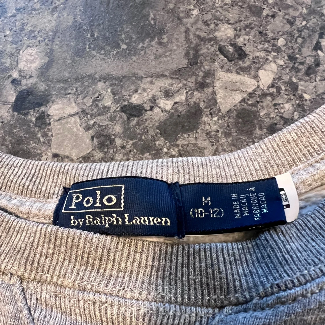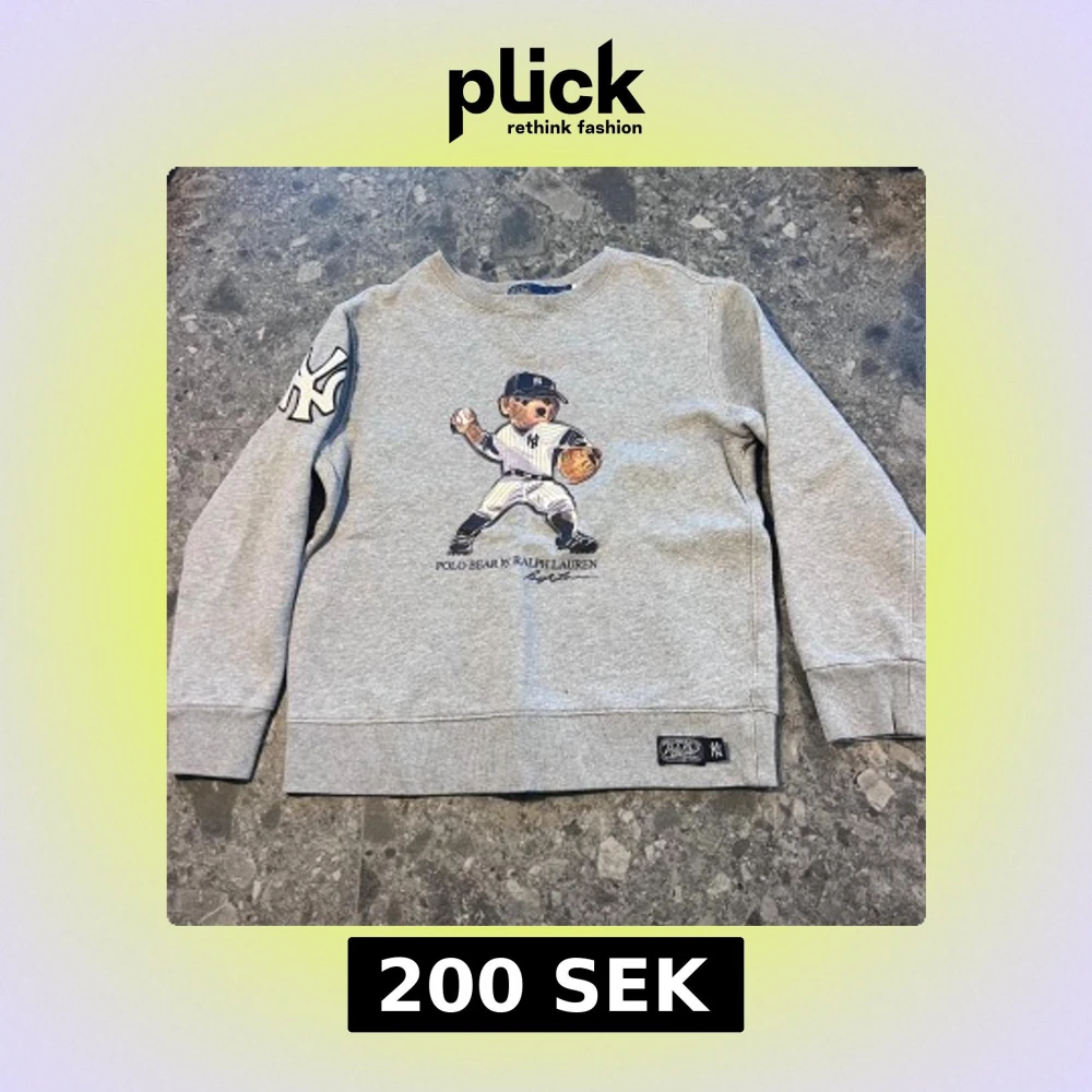 Grå sweatshirt från Polo Ralph Lauren med ikoniska Polo Bear i New York Yankees-baseballoutfit på bröstet. Stort Yankees-märke på ärmen och patch nertill. Klassisk rund hals och långa ärmar. Storlek M (10-12 år)