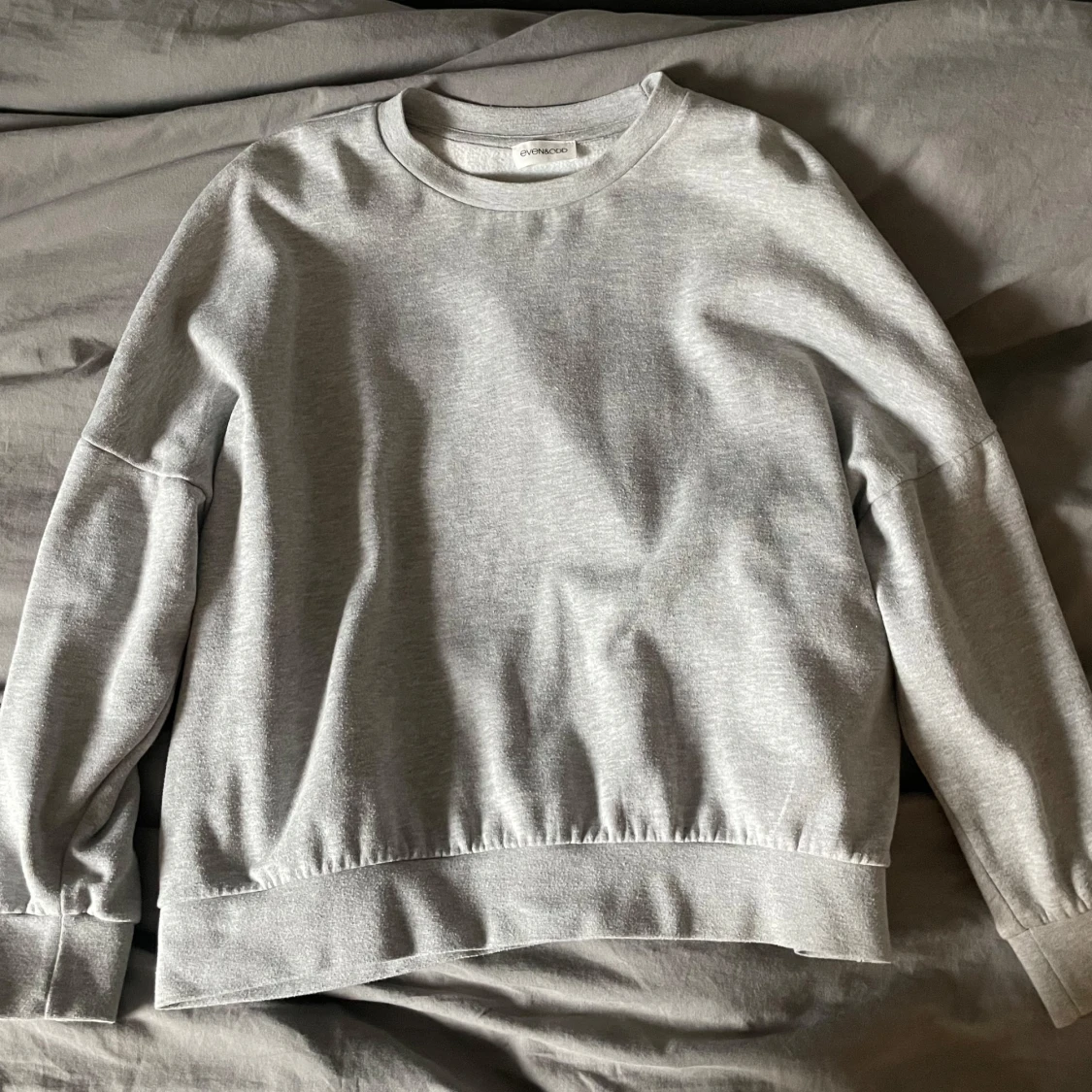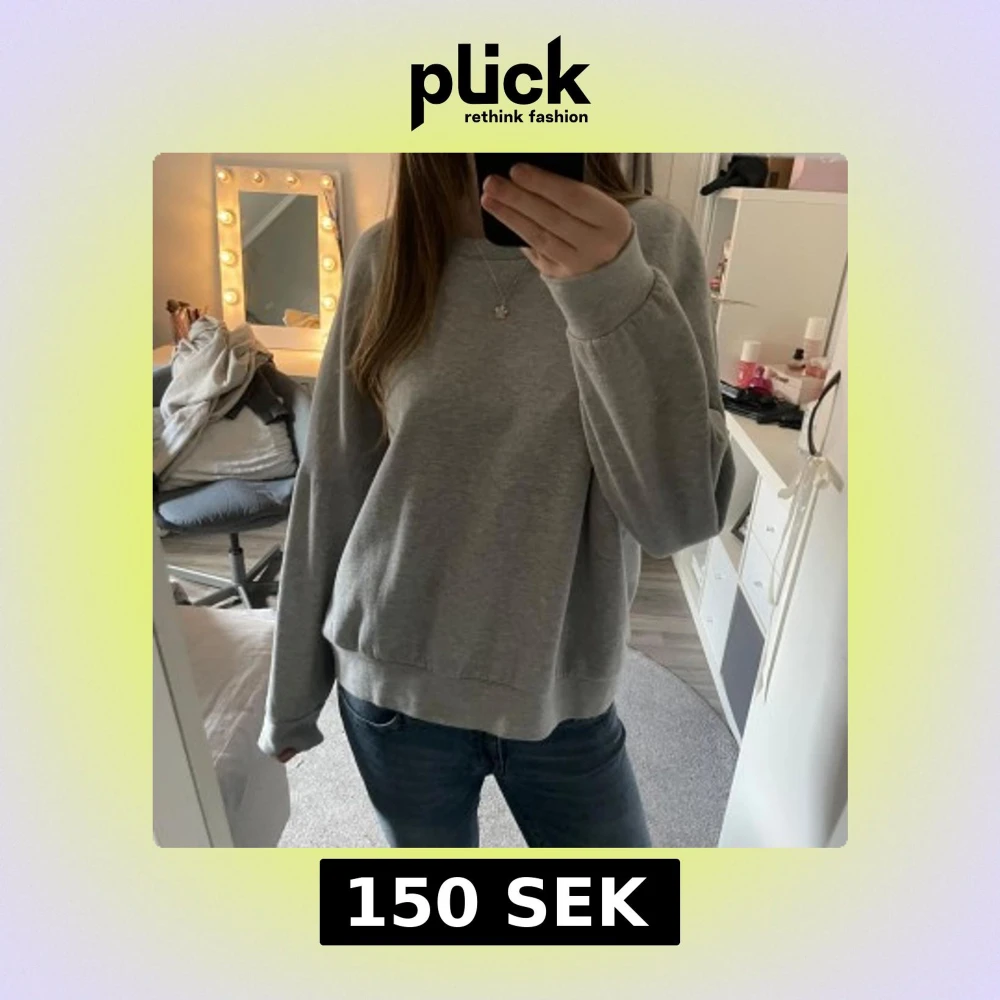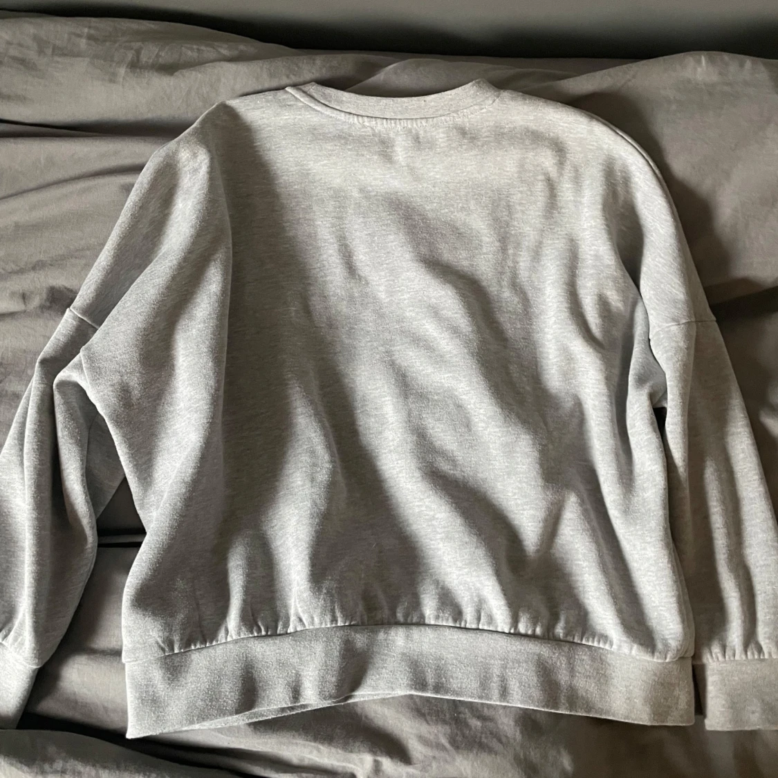 Säljer en grå sweatshirt med rund hals och långa ärmar. Tröjan har ribbade muddar vid ärmslut och nederkant. Står ingen storlek i men skulle uppskatta den som ungefär en storlek S, kanske lite större.