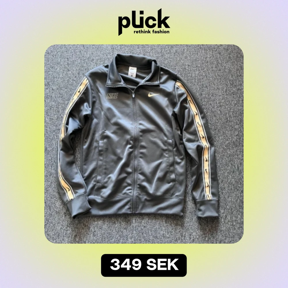 Säljer en snygg grå träningsjacka från Nike. Den har en dragkedja framtill och coola detaljer på ärmarna i guld och svart. Perfekt för träning eller som en casual vardagslook. Jackan är i bra skick och redo för nya äventyr!