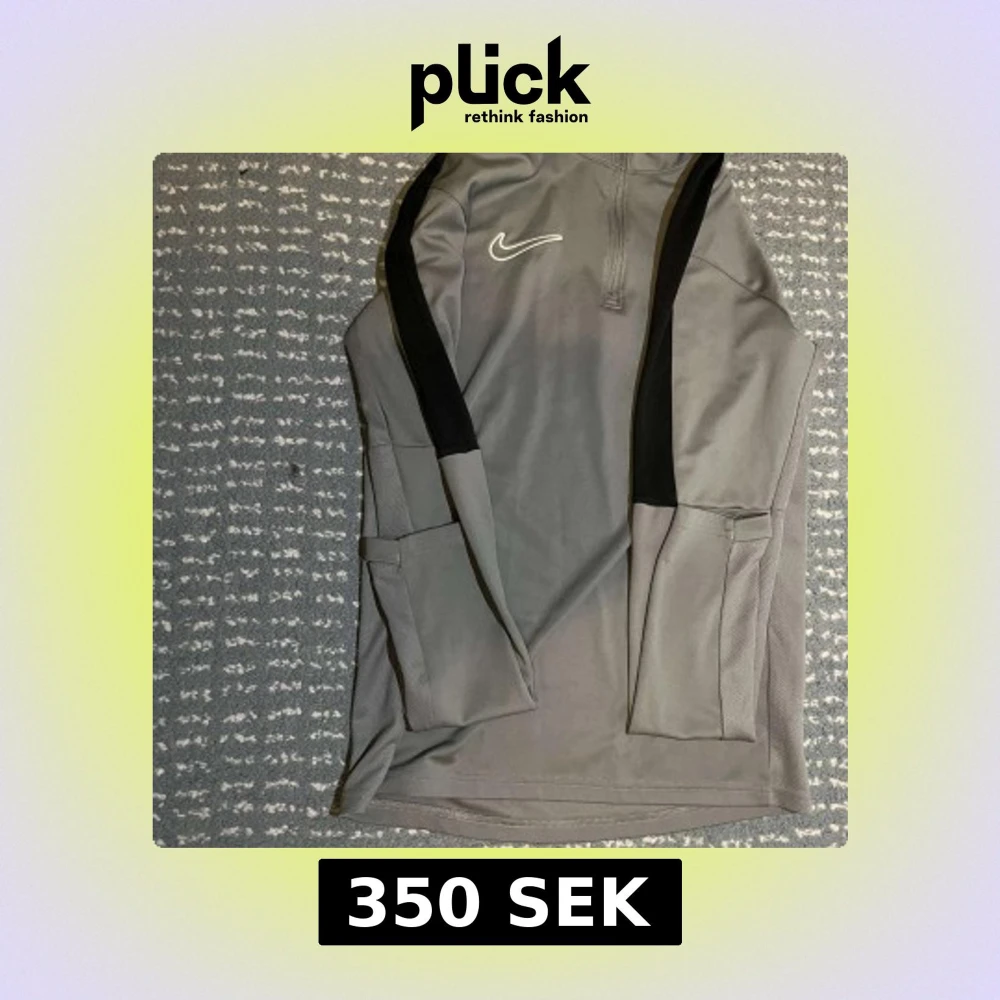 Säljer en grå långärmad träningströja från Nike med svarta paneler längs ärmarna och halv dragkedja framtill. Tillverkad i Dri-Fit material som andas och transporterar bort fukt. Perfekt för sport och träning. Om du vill ha en tightare look passar den S också