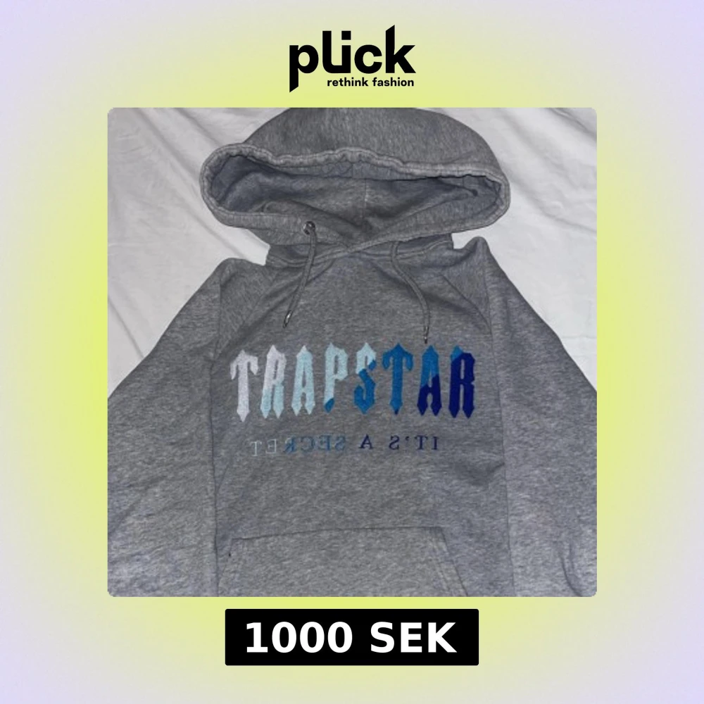 Säljer en grå hoodie från Trapstar med huva och snörning. Framsidan har ett stort tryck i olika blå nyanser med texten 'TRAPSTAR' och 'IT'S A SECRET' under. Hoodien har en klassisk känguruficka och är perfekt för chill dagar.