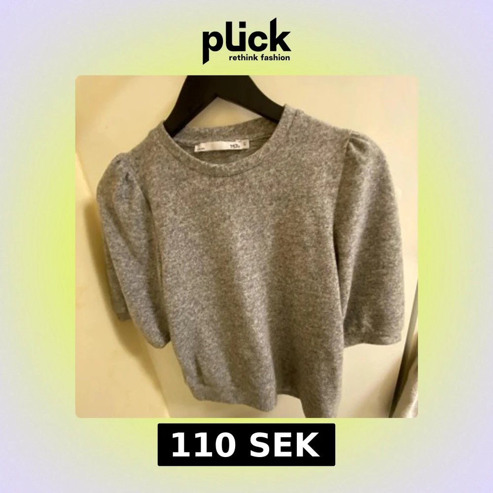 Säljer en stilren grå tröja från Lager 157 med puffiga trekvartsärmar. Tröjan har en rund halsringning och är gjord i ett mjukt material.