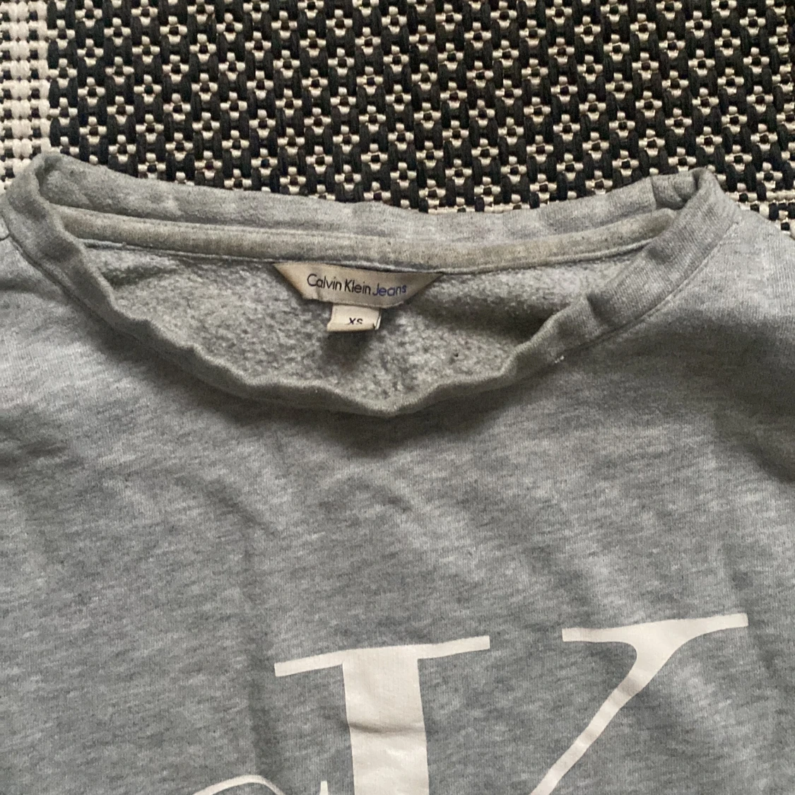 Säljer en stilren grå tröja från Calvin Klein Jeans med det ikoniska CK-logotypen i vitt på framsidan. Tröjan har långa ärmar och en rund halsringning. Perfekt för en avslappnad look. Har lite avfärgning vid kragen.