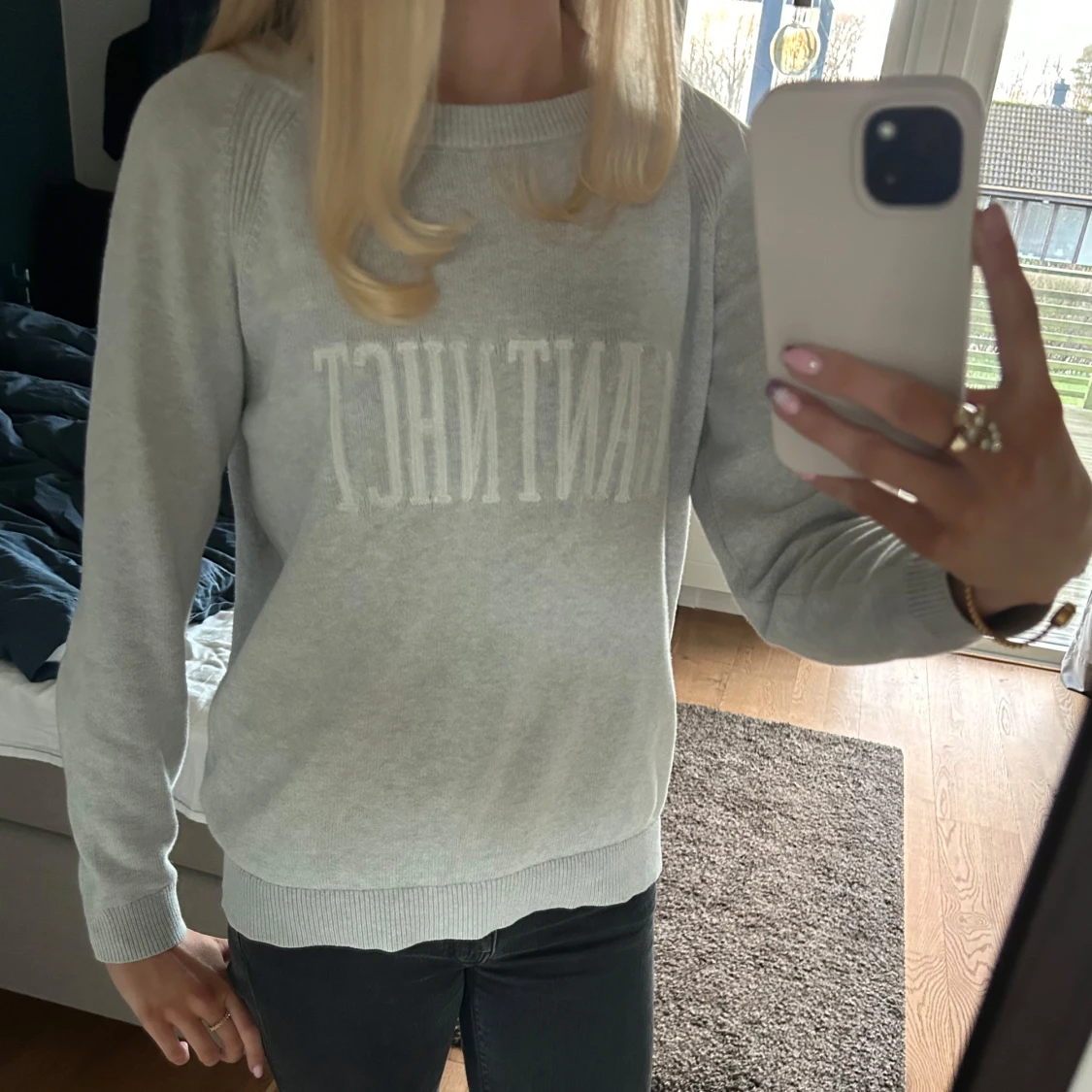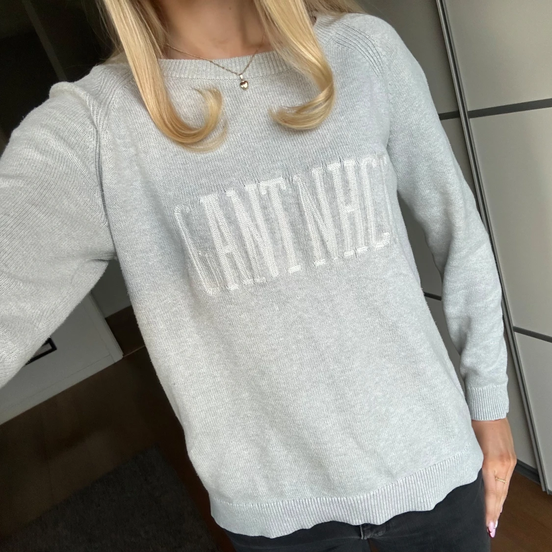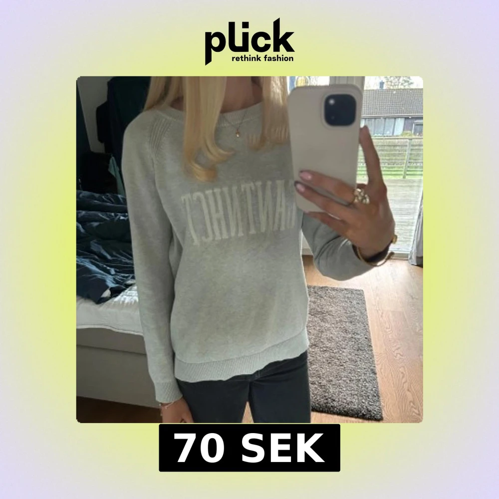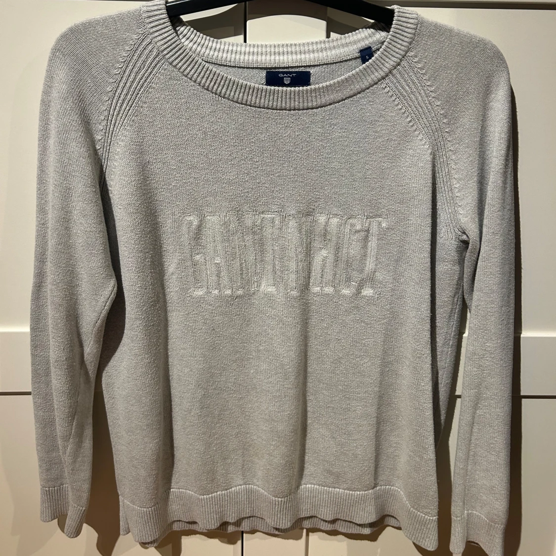 Snygg grå tröja från Gant med textdetalj på framsidan. Tröjan har långa ärmar och en rund halsringning. 💗💗Lite osäker på storleken för det står inte i tröjan, men jag skulle uppskatta att den är typ XS-S🫶🏻
