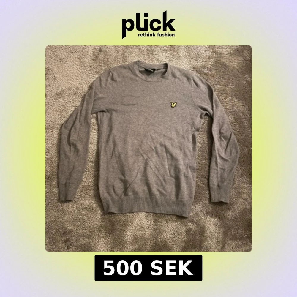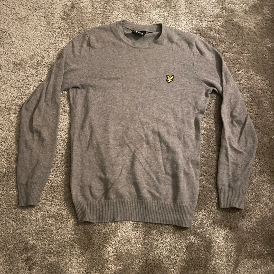 Säljer en stilren grå tröja från Lyle & Scott med deras klassiska gula fågel-logga på bröstet. Tröjan har rund halsringning, långa ärmar och ribbade muddar vid ärmslut och nederkant. Perfekt för dig som gillar enkel och snygg stil.