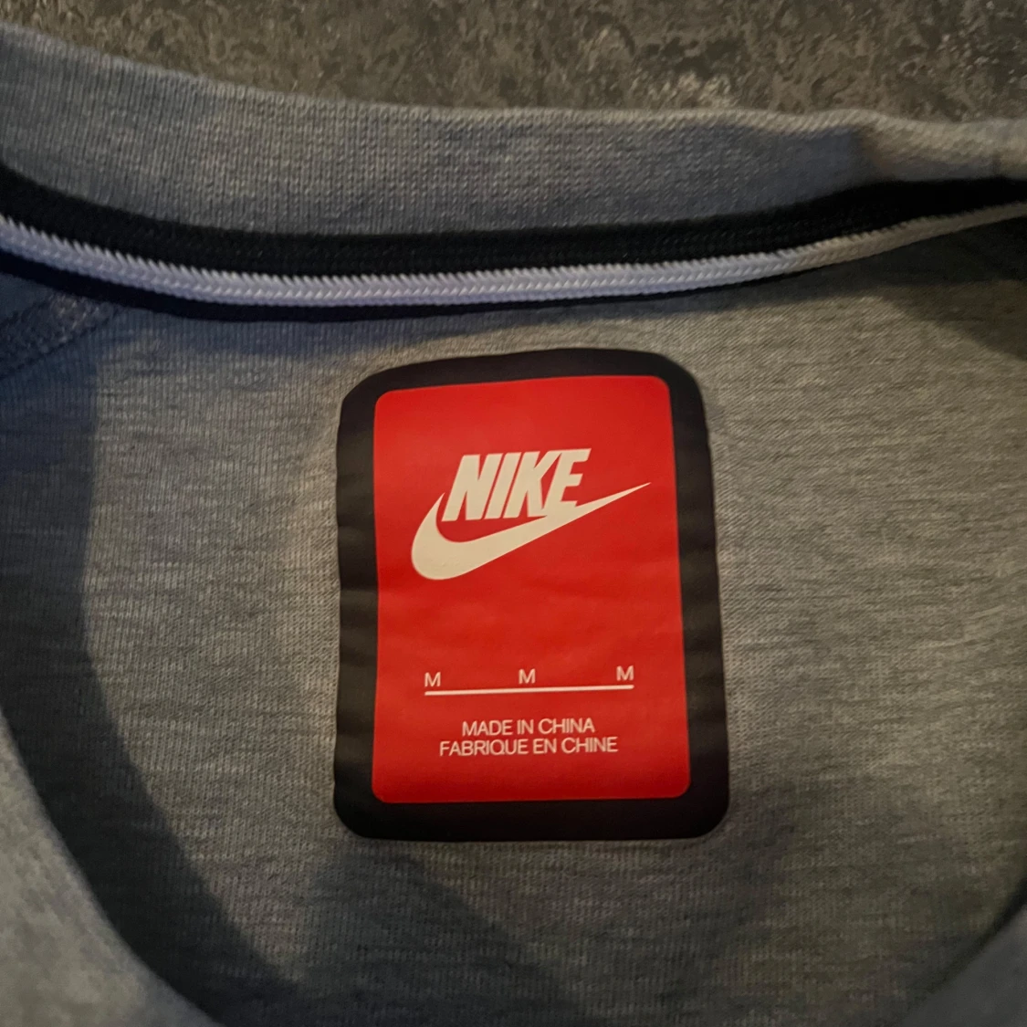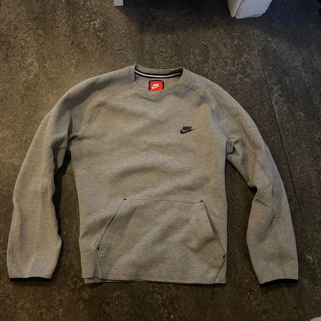 Säljer en stilren grå tröja från Nike med lång ärm och en liten Nike-logga på bröstet. Tröjan har en praktisk ficka framtill och är perfekt för en avslappnad stil.