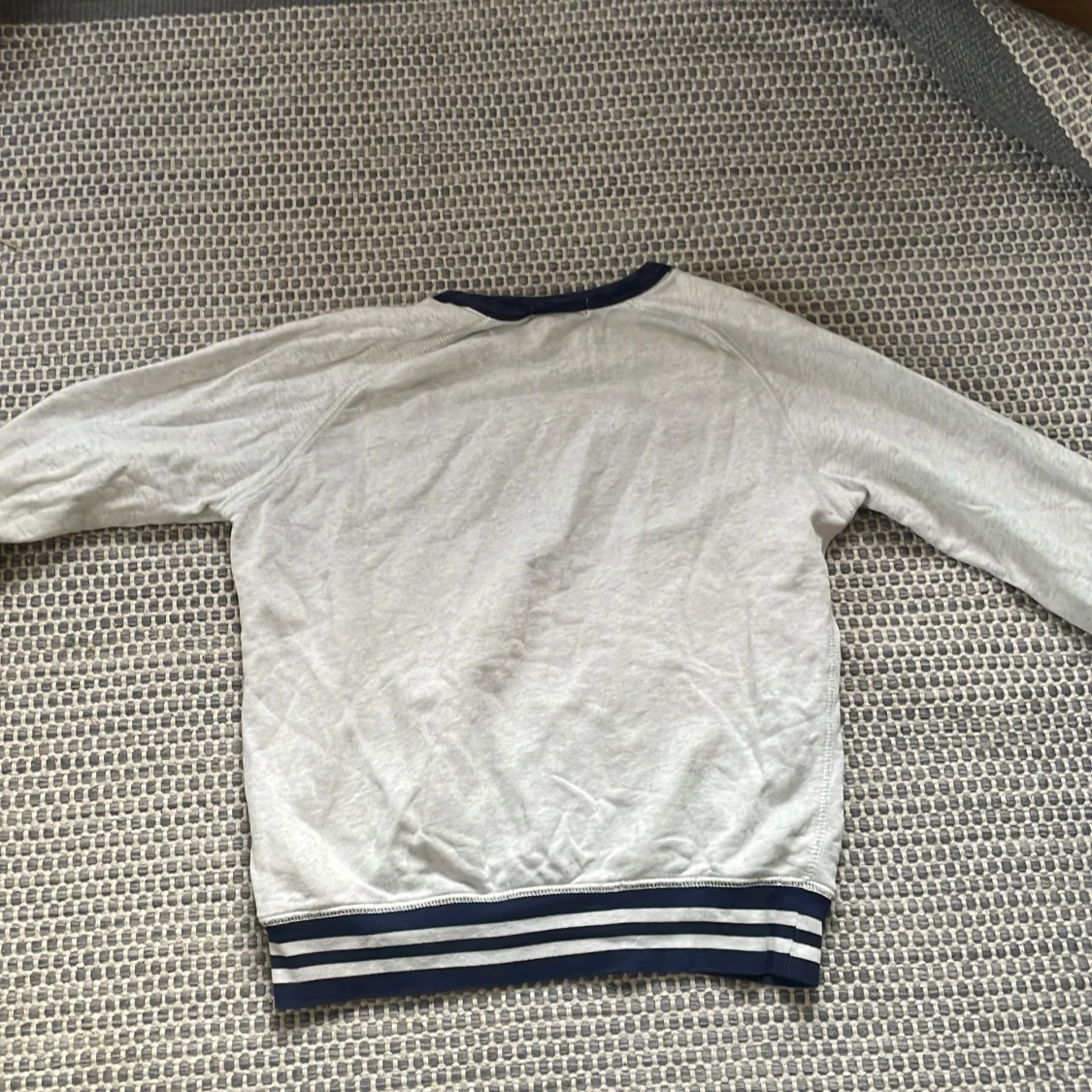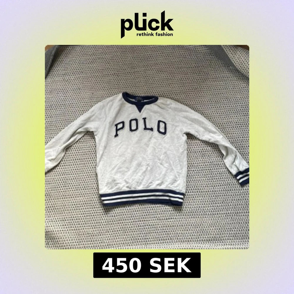 Säljer en vit tröja från Ralph Lauren med blå detaljer och texten 'POLO' på framsidan. Tröjan har långa ärmar och ribbade muddar vid ärmslut och nederkant. Perfekt för en avslappnad stil.