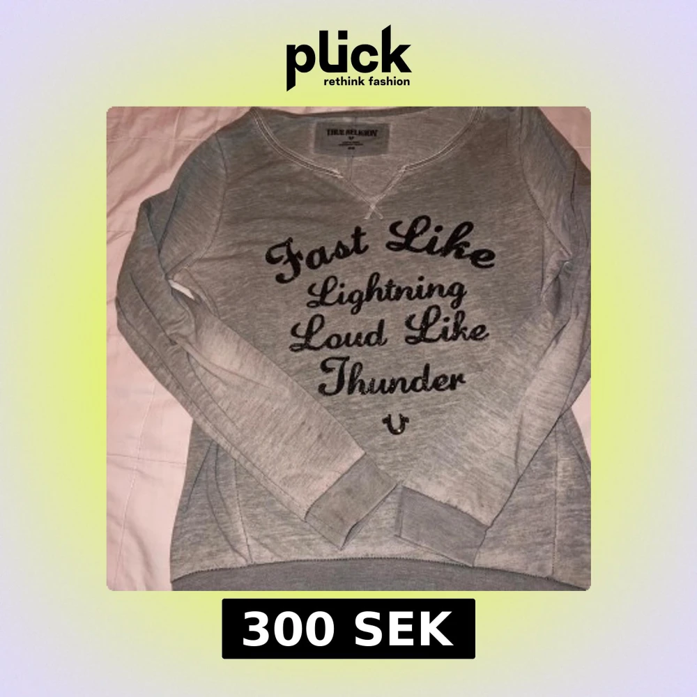 Säljer en grå tröja från True Religion med texten 'Fast Like Lightning, Loud Like Thunder' i svart glitter. Tröjan har långa ärmar och en bekväm passform. Perfekt för en avslappnad stil.