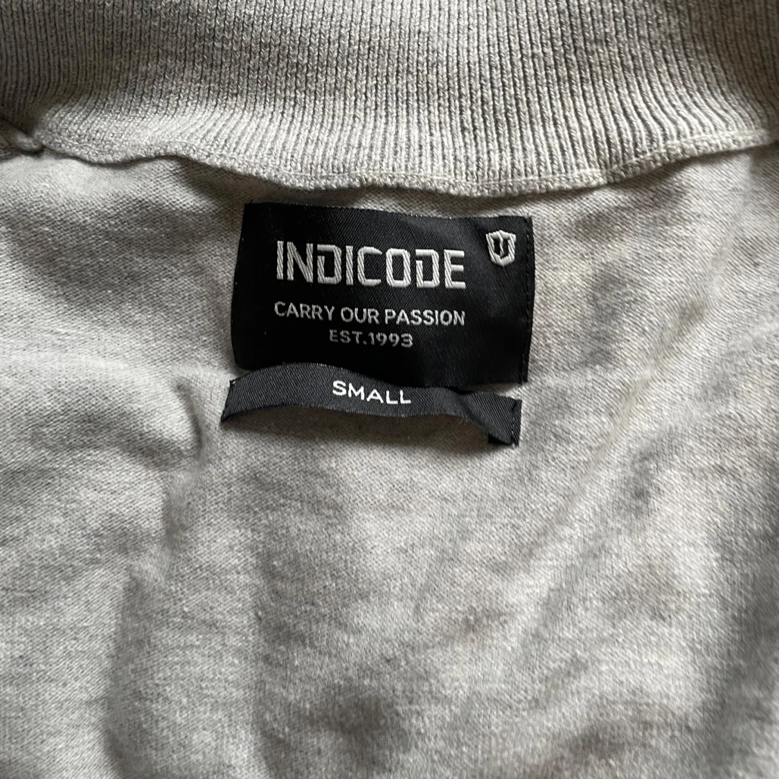 Säljer en stilren grå tröja från Indicode med dragkedja. Tröjan har en hög krage och långa ärmar, perfekt för en avslappnad stil. Passar bra till jeans eller chinos.