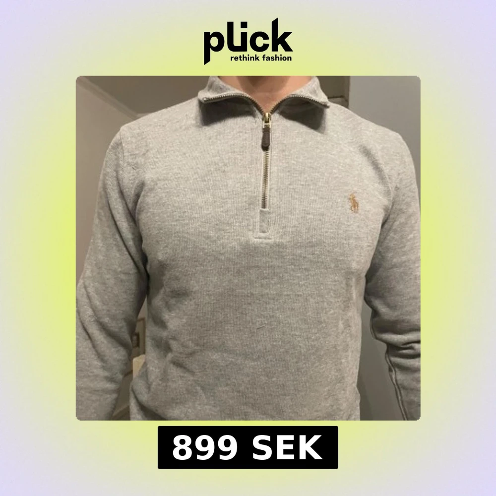 Säljer en stilren grå tröja från Ralph Lauren med dragkedja och broderad logga på bröstet. Tröjan har långa ärmar och en klassisk krage. Perfekt för en avslappnad men ändå elegant look.