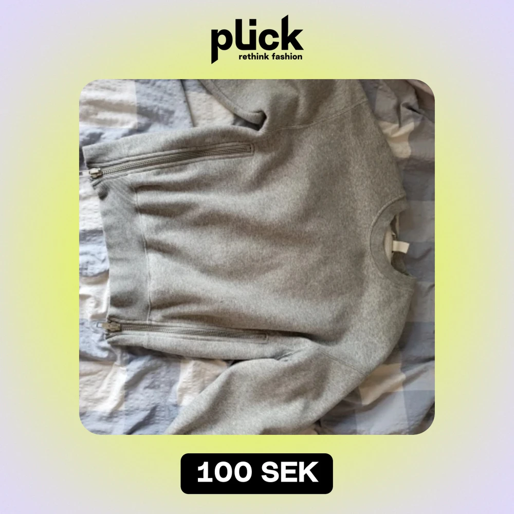 En grå tröja med rund hals och dragkedjor på sidorna. Tröjan har långa ärmar och ribbstickade muddar vid ärmslut och nederkant.