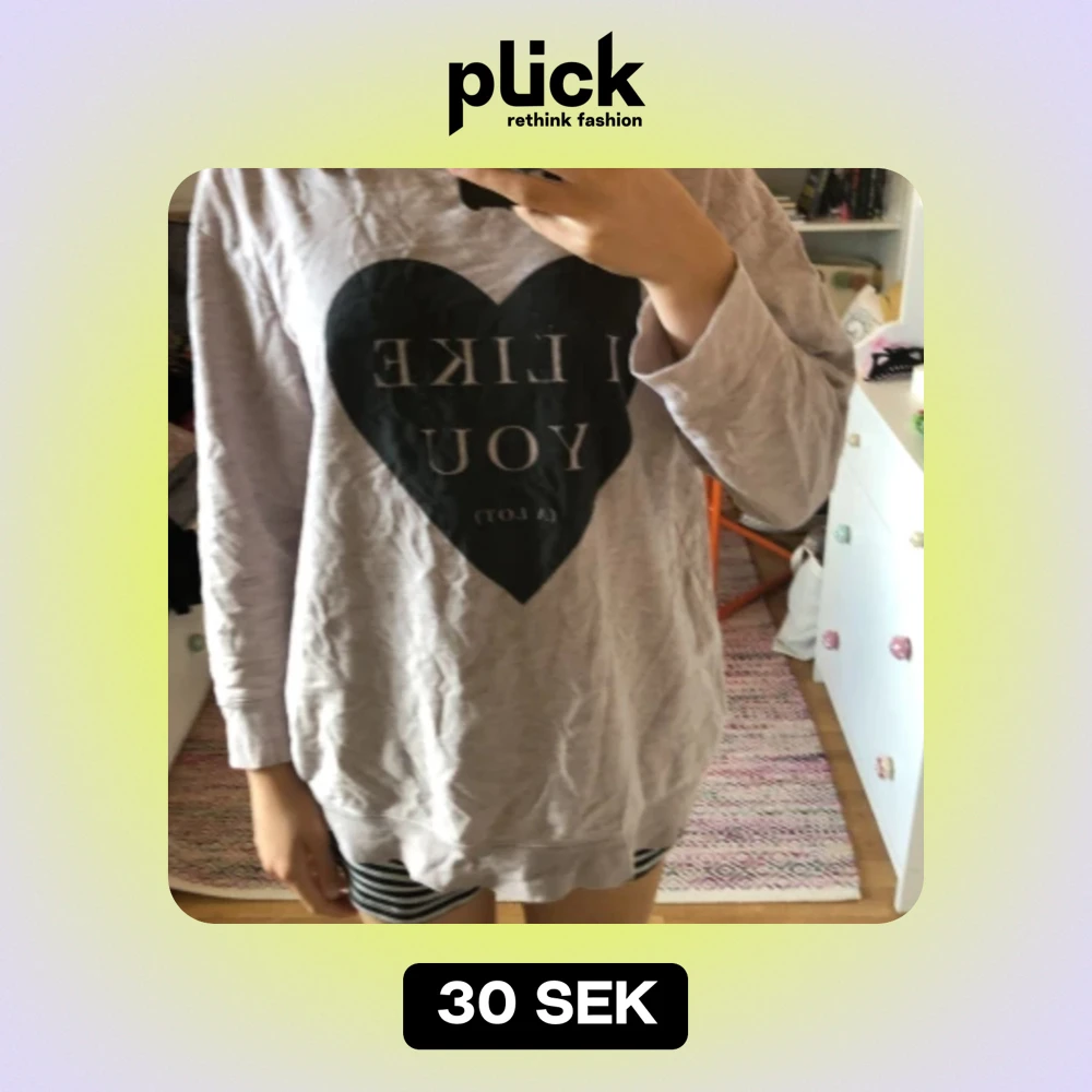 Säljer en grå tröja med texten 'I LIKE YOU (A LOT)' tryckt i ett svart hjärta på framsidan. Tröjan är långärmad och har en avslappnad passform. Perfekt för en mysig dag hemma eller en avslappnad dag ute. Tröjan är i bra skick och väldigt bekväm att ha på sig.