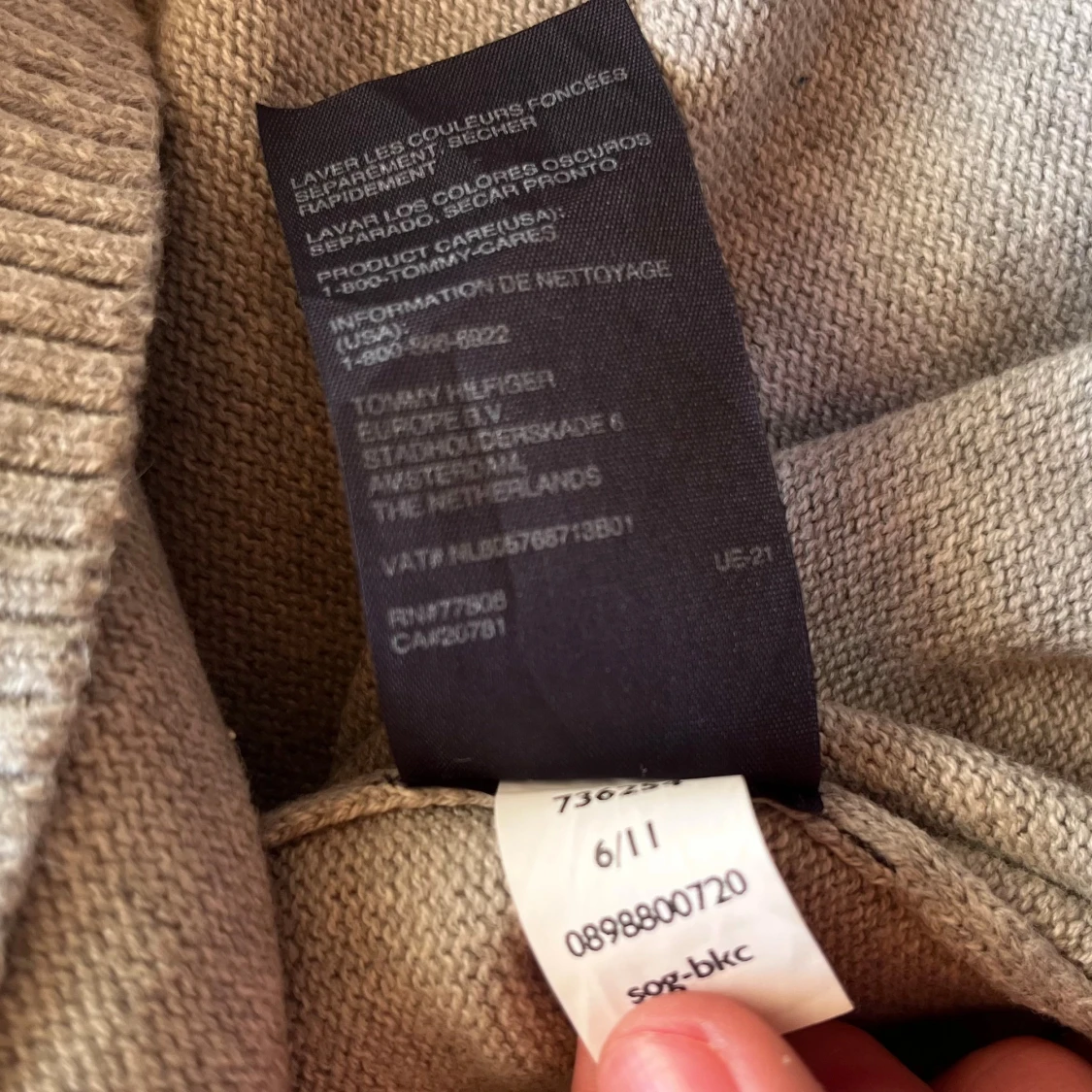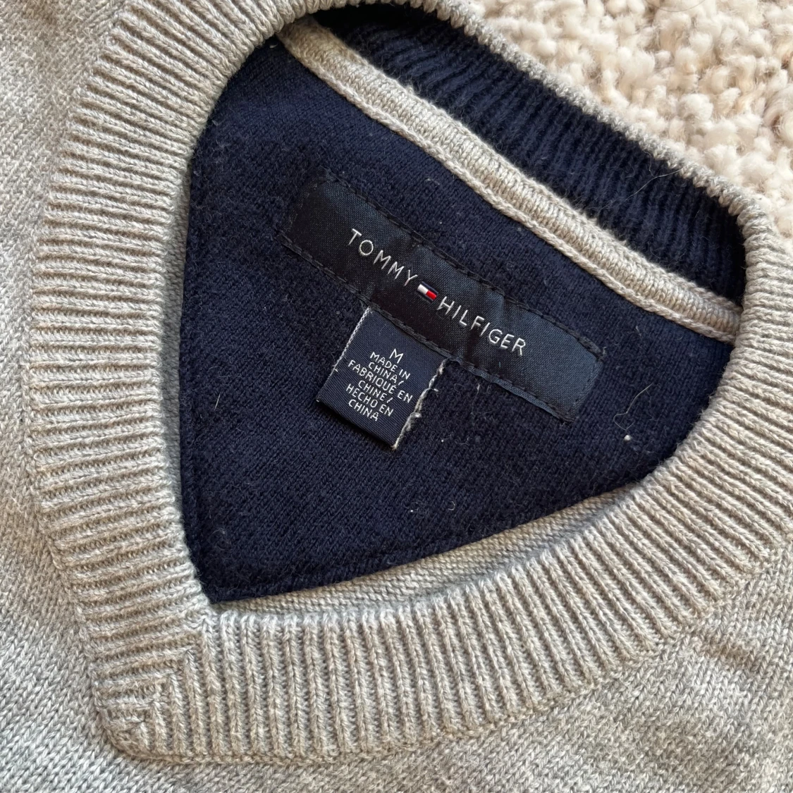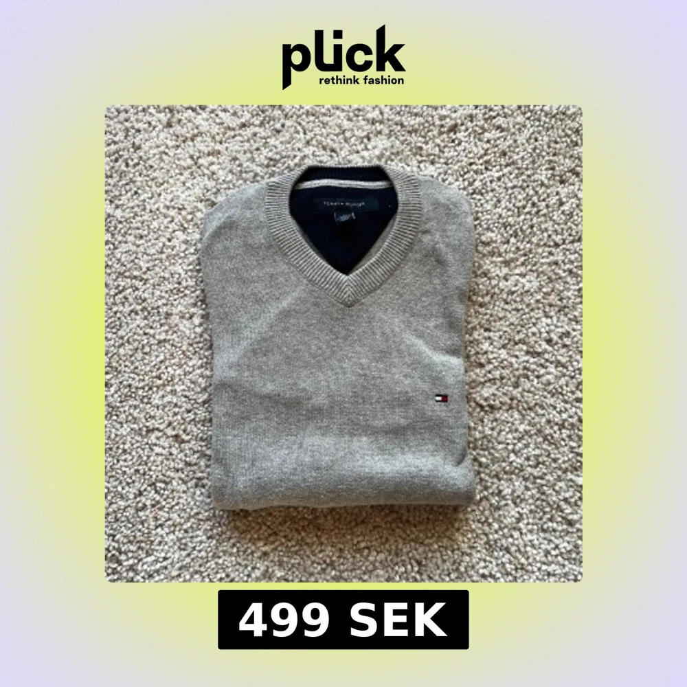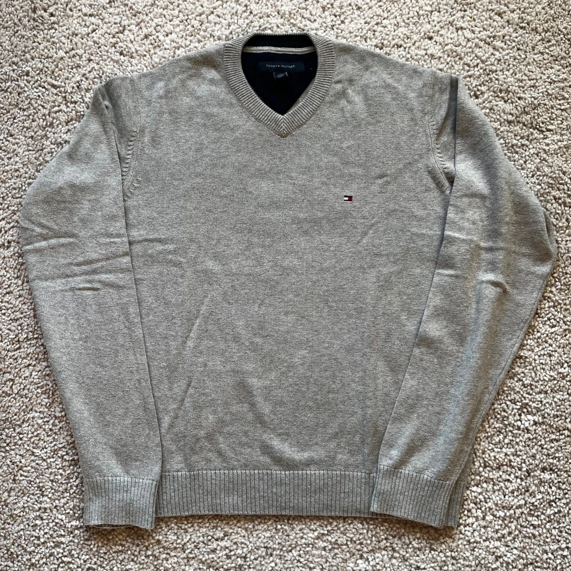 Klassisk grå v-ringad tröja från Tommy Hilfiger med diskret logga broderad på bröstet. Tröjan är långärmad och har ribbade muddar vid ärmslut och nederkant. Tillverkad i mjuk bomull, perfekt för lager-på-lager under höst och vinter. Enda defekten är en linje rostfläckar från att ha hängt på en ställning. De är på baksidan av tröjan och syns på sista bilden. Men fläckarna syns knappt när man har på sig tröjan.