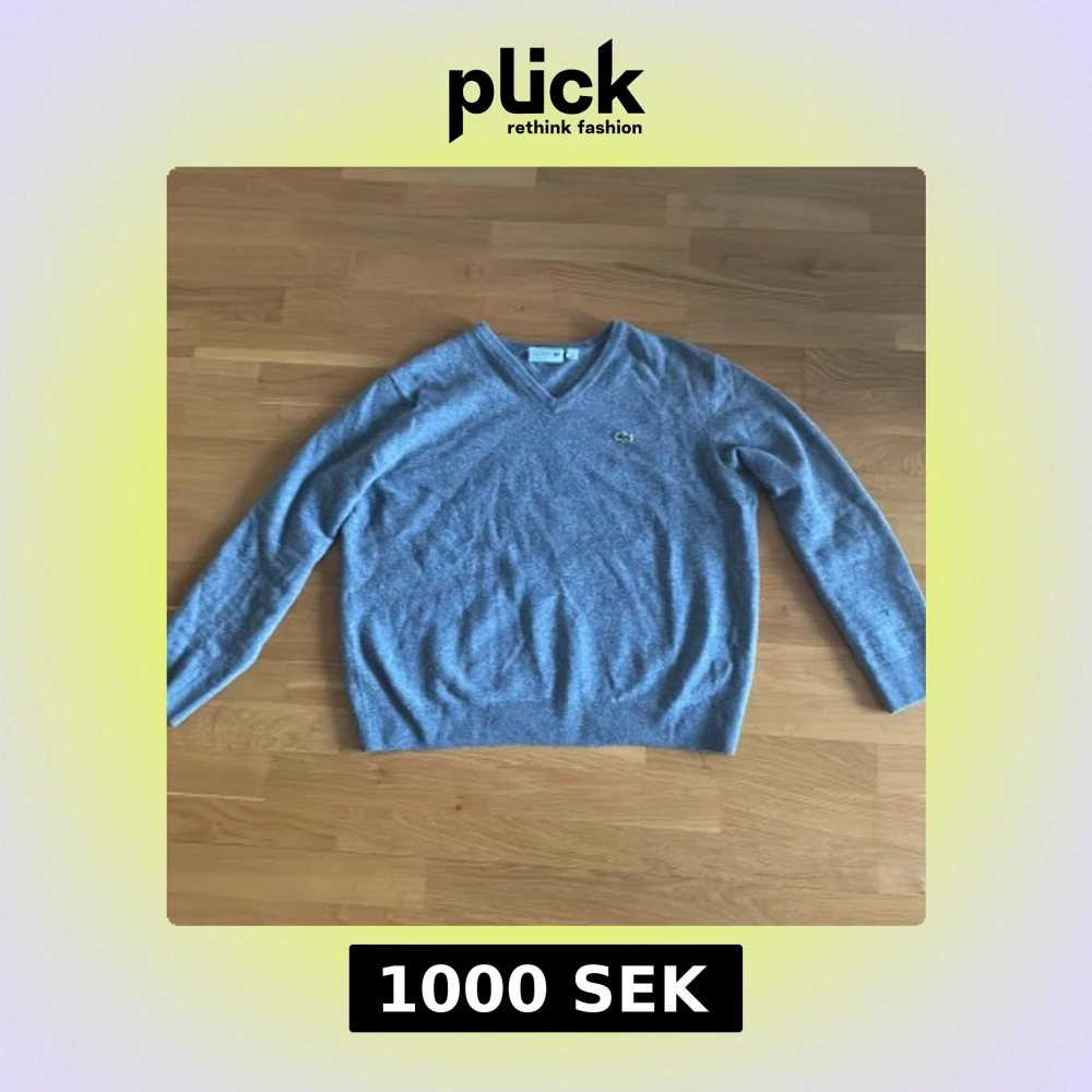 Säljer en klassisk grå v-ringad tröja från Lacoste med den ikoniska krokodilloggan på bröstet. Tröjan är tillverkad i ren ull och har långa ärmar samt ribbade muddar vid ärmslut och nederkant. Är som ny, original pris ca 1800