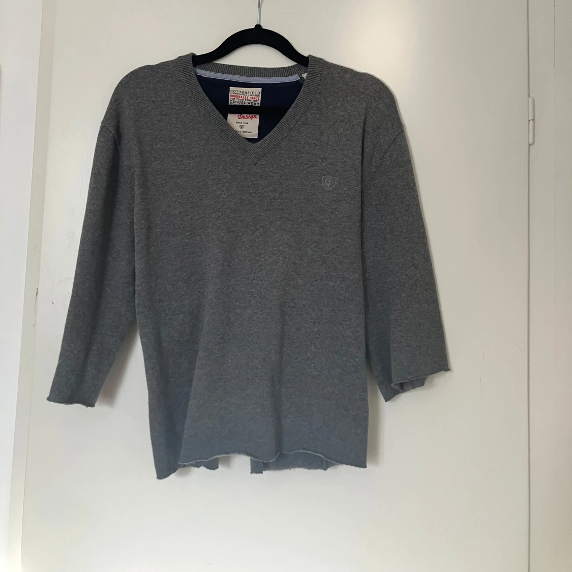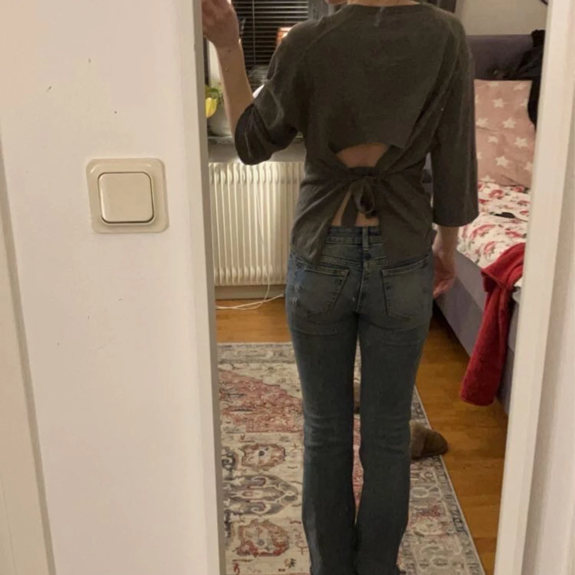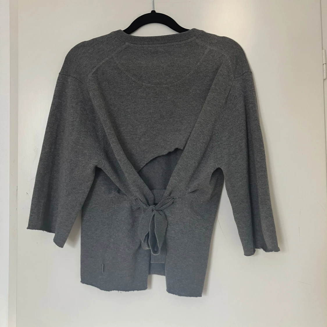 Säljer en stilren grå tröja med v-ringning och trekvartsärmar. Tröjan har en unik design med öppen rygg och knytning bak, vilket ger en trendig look. Perfekt för att lägga till en twist i din garderob!