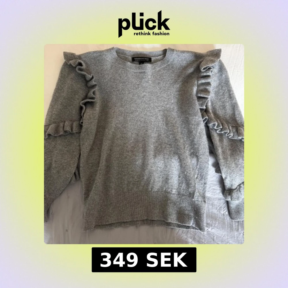 Superfin grå stickad tröja från Banana Republic med volangdetaljer längs axlar och ärmar. Mjuk och skön, perfekt för lager-på-lager. Rund halsringning och ribbade muddar. Tillverkad av italienskt garn.