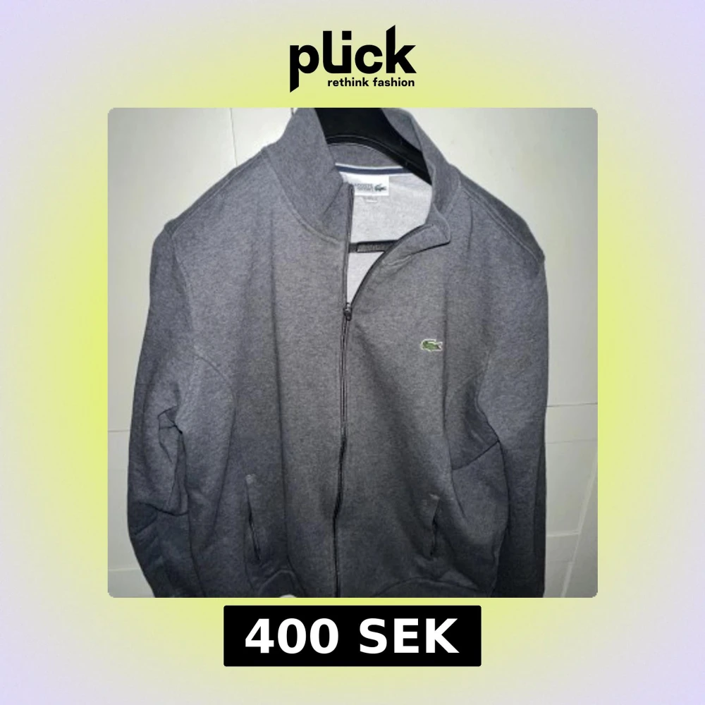 Säljer en stilren grå jacka från Lacoste med dragkedja framtill och klassisk krokodil-logga på bröstet. Jackan har hög krage och två fickor med dragkedja. Perfekt för dig som gillar enkel och sportig stil.