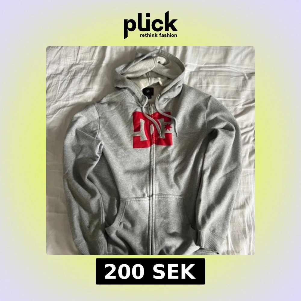 Säljer en grå hoodie från DC med röd logga på framsidan. Tröjan har dragkedja och justerbar huva med snören. Skriv om det finns några frågor!