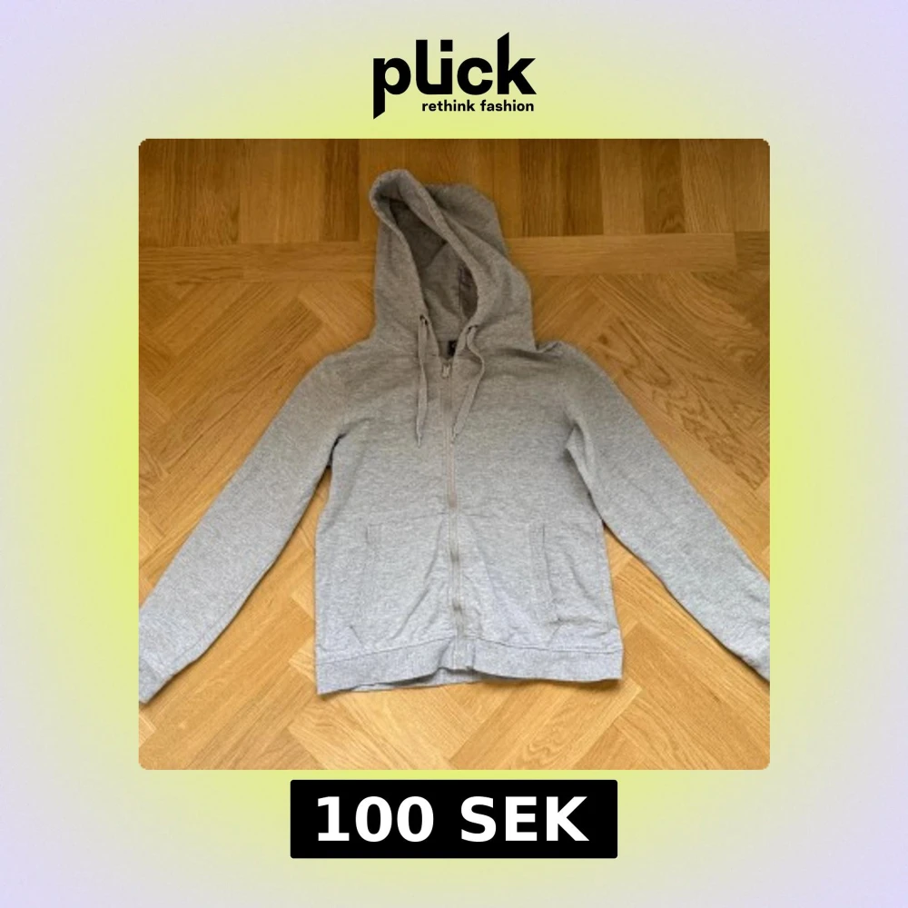 Säljer en enkel grå zip up hoodie i storlek S. Tröjan har dragkedja framtill, två fickor och snörning vid huvan. Märke på bild 2.