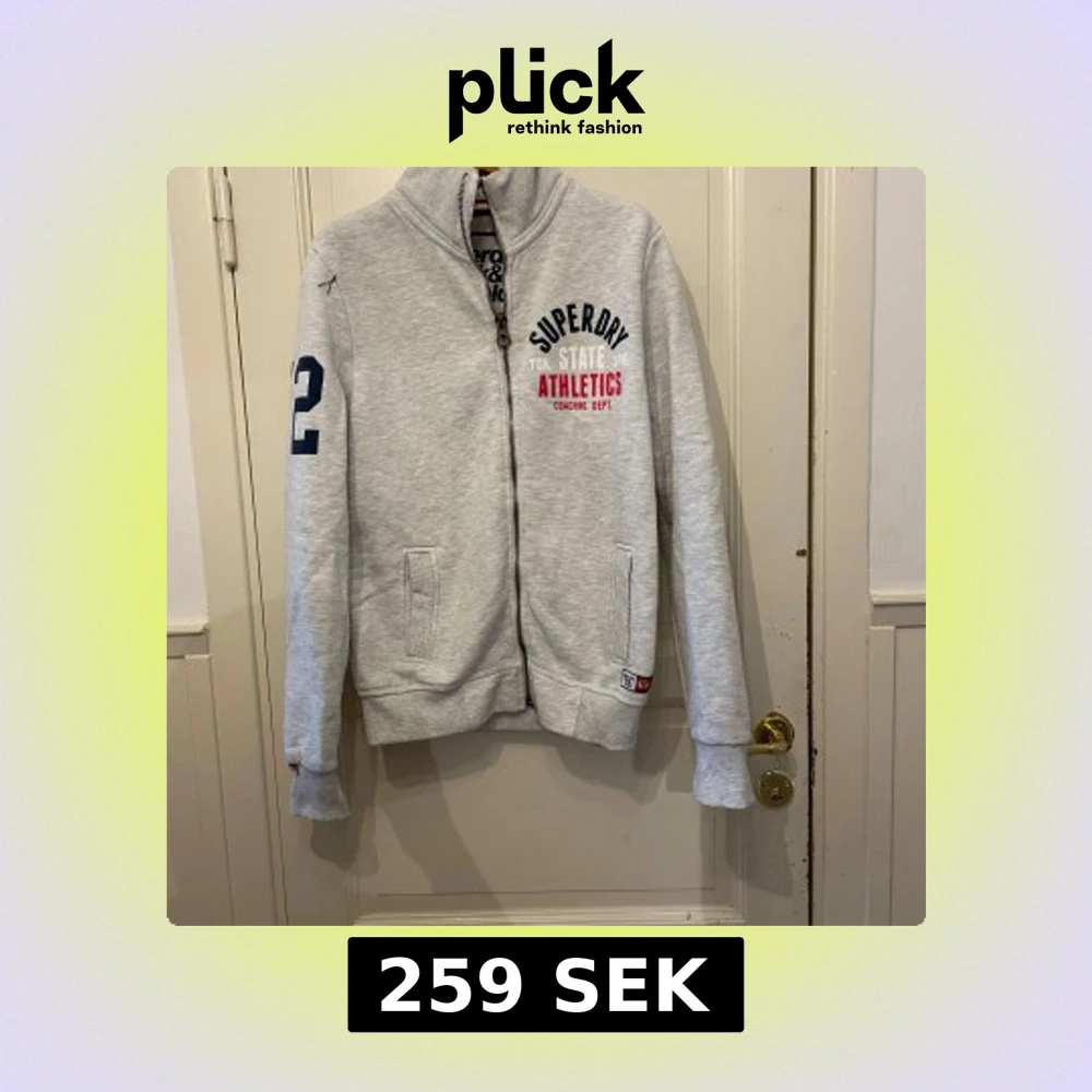 Säljer en ljusgrå ziptröja från Superdry med tryck i blått, vitt och rött framtill och på ryggen. Tröjan har hög krage, två fickor och muddar vid ärmslut och nederkant. Perfekt för en sportig look!
