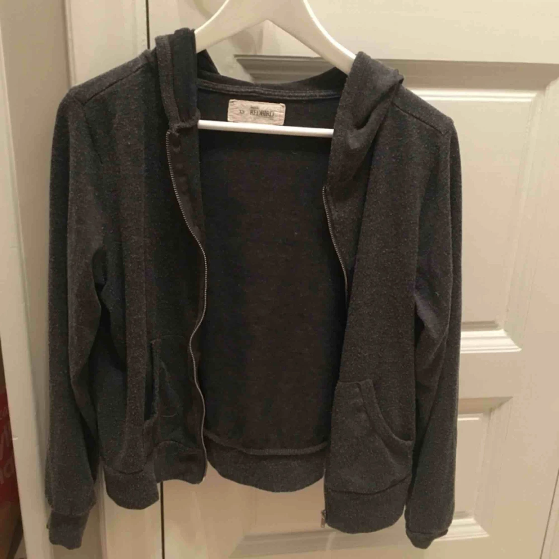 En grå kofta med huva. Den är sjuukt skön. Vi möts gärna upp i Stockholm men om frakt betalar köparen det
