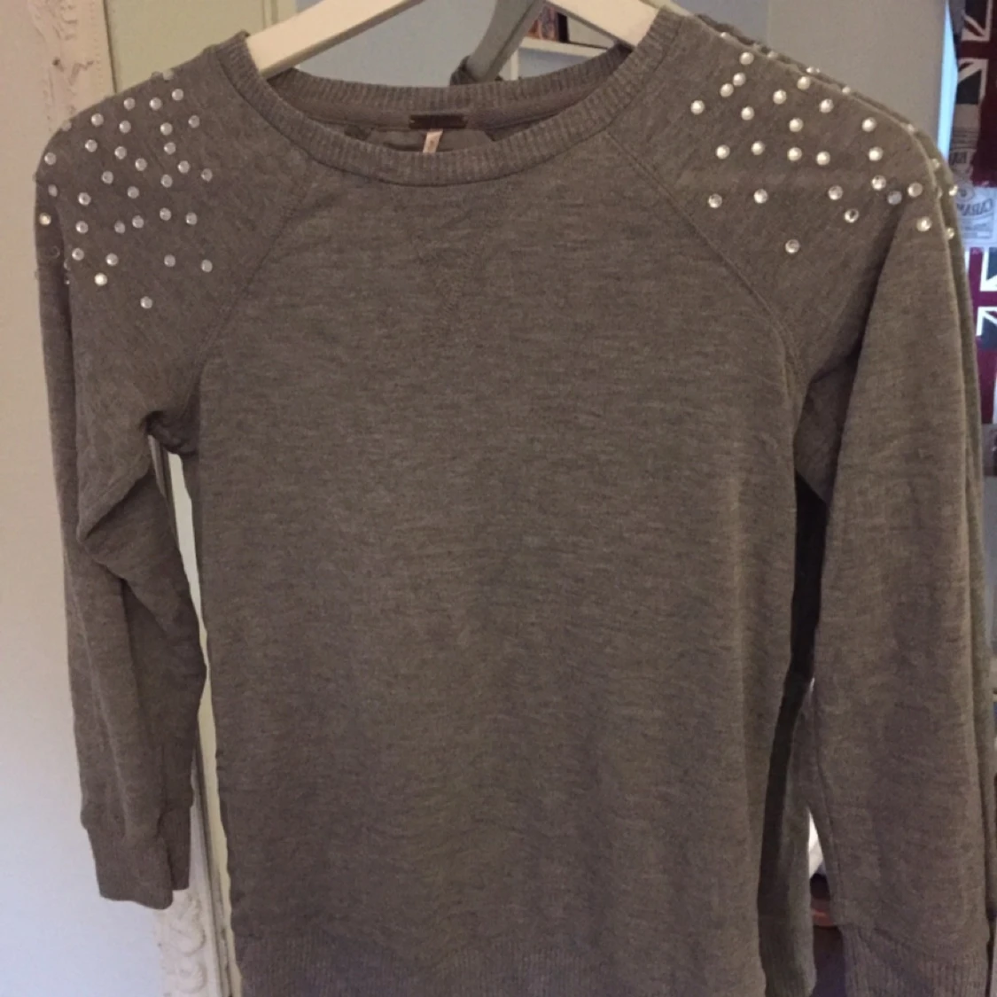 Grå tröja med detaljer längst axlarna och armen, ryggen har ett lite tunnare material och den är köpt i USA, använd en gång. Vid frakt tillkommer 30 kr