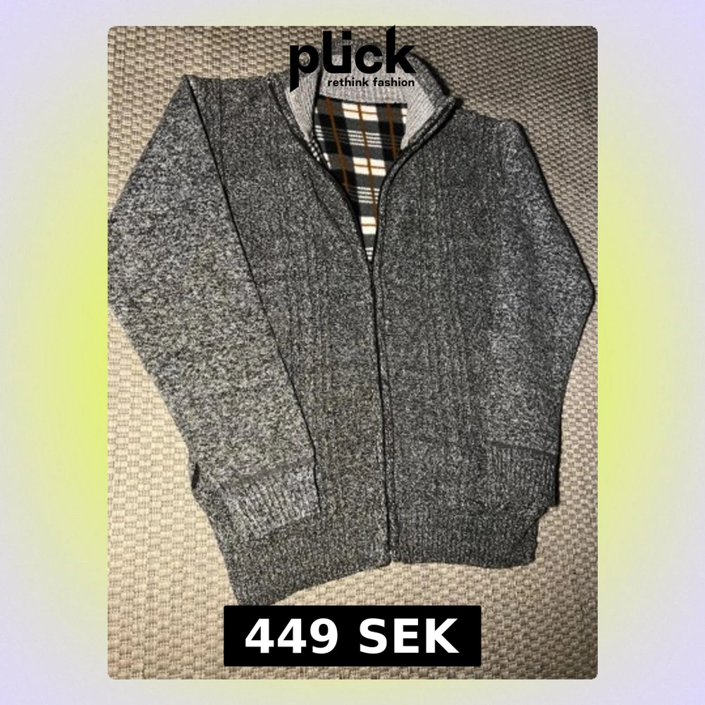 Mysig grå ziptröja med ribbade muddar och ståkrage. Insidan har ett rutigt foder i svart, vitt och orange som ger extra stilpoäng. Perfekt för lager på lager och chill dagar. Tröjan är stickad och har en klassisk, avslappnad passform.