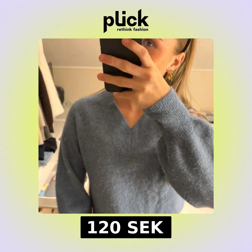 Mysig blå stickad tröja från Stockh LM med v-ringad hals och bred ribbad. Loggan på armen har halvt lossnat genom en tråd men går enkelt att laga!💕