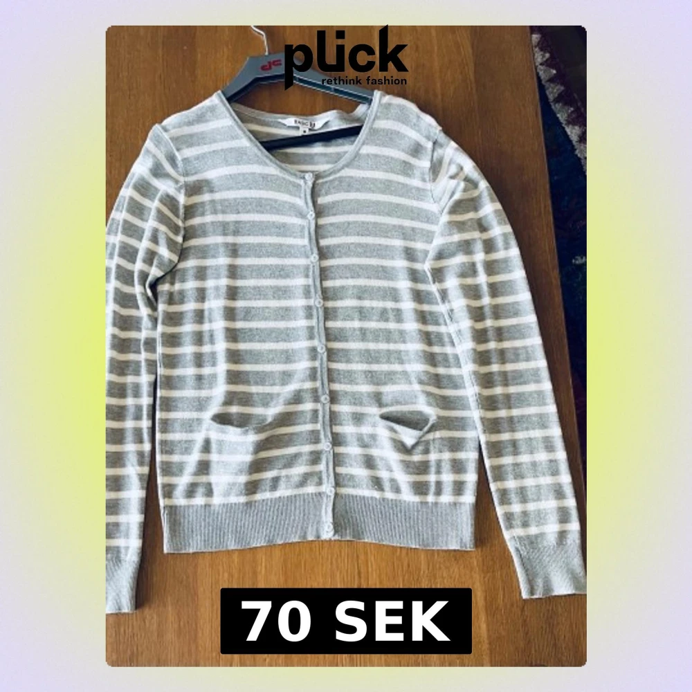 Säljer en grå och vit randig kofta från Basic U i storlek M. Koftan har långa ärmar, rund halsringning och knäppning framtill med matchande knappar. Tillverkad i mjuk viskosmix och har två små fickor framtill. Perfekmt för lager på lager under kyliga dagar.
