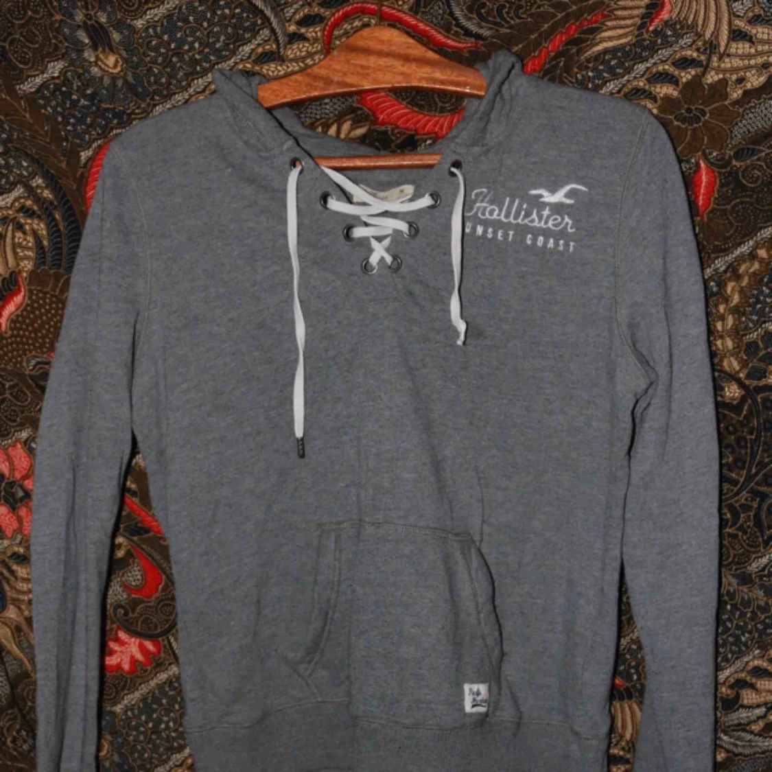 Grå Hollister tunn hoodie. Skick 8/10 ena snöret är lite trasigt men det är inget som märks. Köparen står för eventuell frakt 🥰🥰