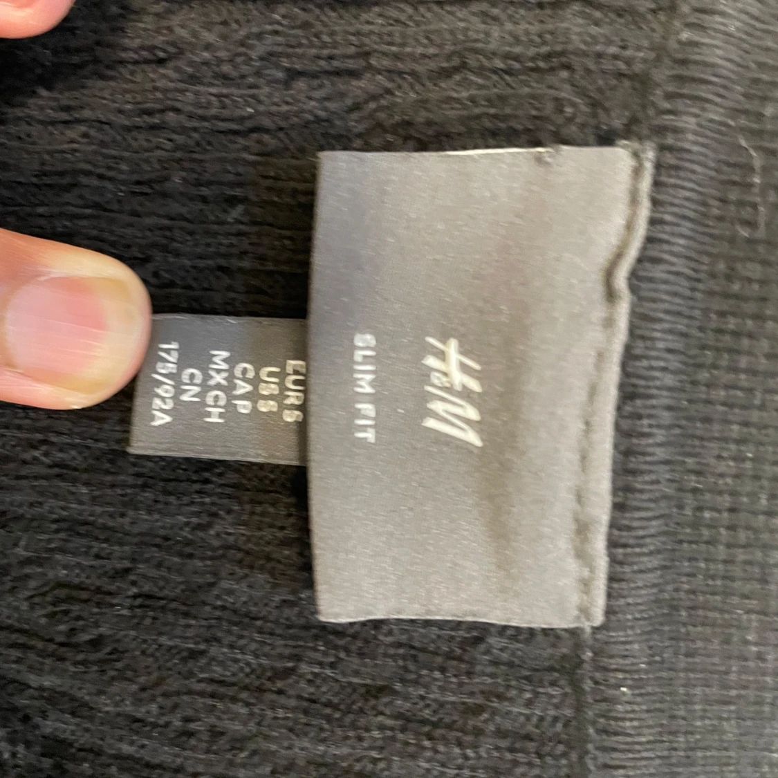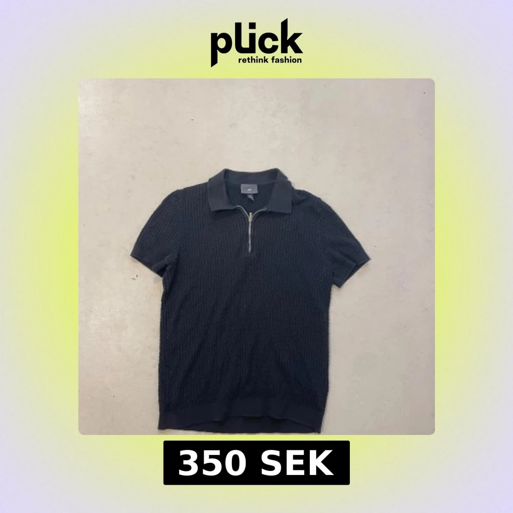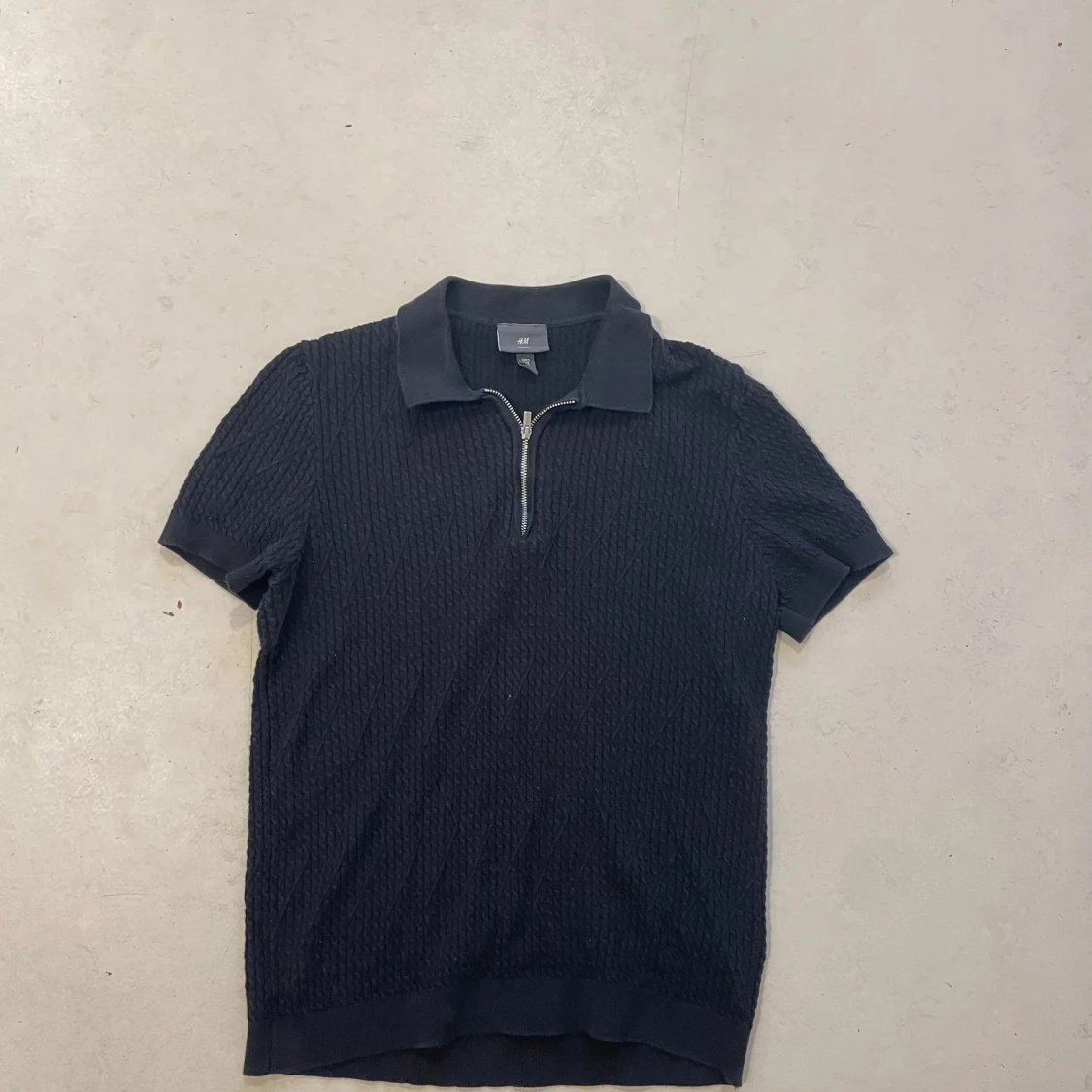 Säljer en svart pikétröja från H&M med korta ärmar och dragkedja vid halsen. Tröjan har en slim fit passform och är tillverkad i ett strukturerat material som ger en snygg look. Perfekt för dig som gillar stilrena plagg.