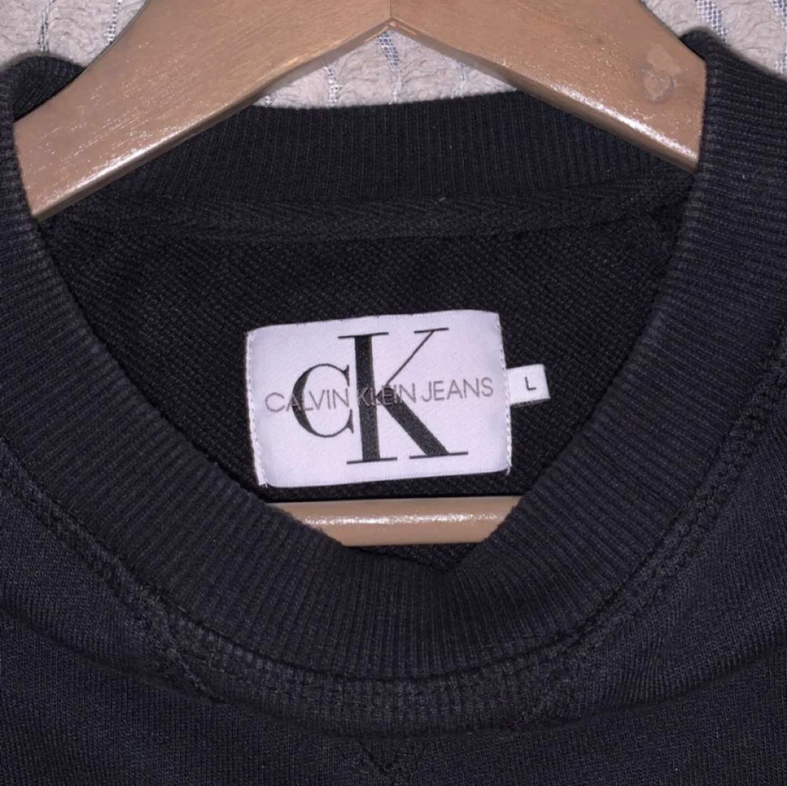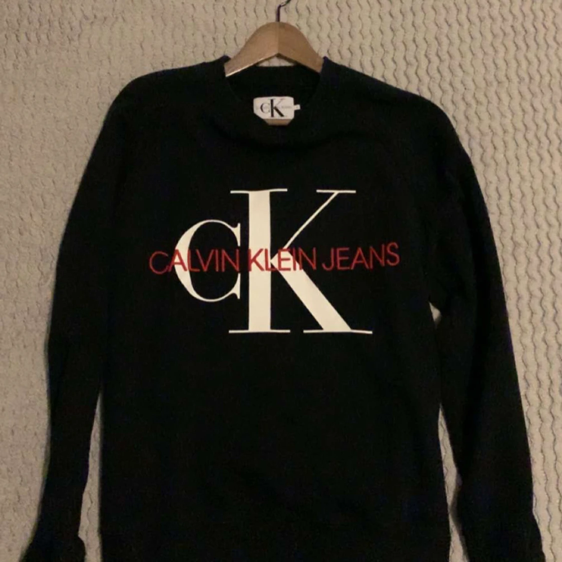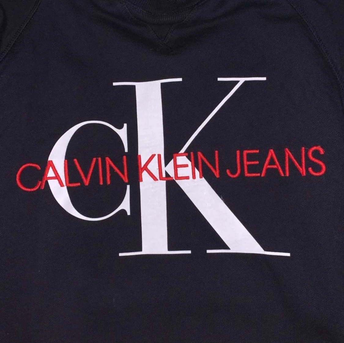 Svart sweatshirt från Calvin Klein Jeans med stort vitt CK-tryck och röd broderad logga på bröstet. Tröjan har rund hals, långa ärmar och är tillverkad i mjuk bomull. Perfekt för en chill och stilren look. Hör hjärna av er😁