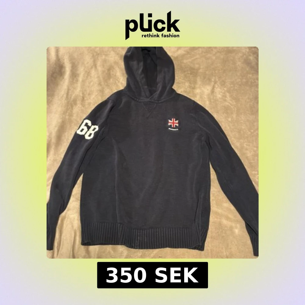 Snygg mörkblå stickad hoodie från Morris med broderad Union Jack-logga på bröstet och stort vitt 68-tryck på ena ärmen. Tröjan har ribbade muddar och huva, perfekt för en chill och sportig stil.