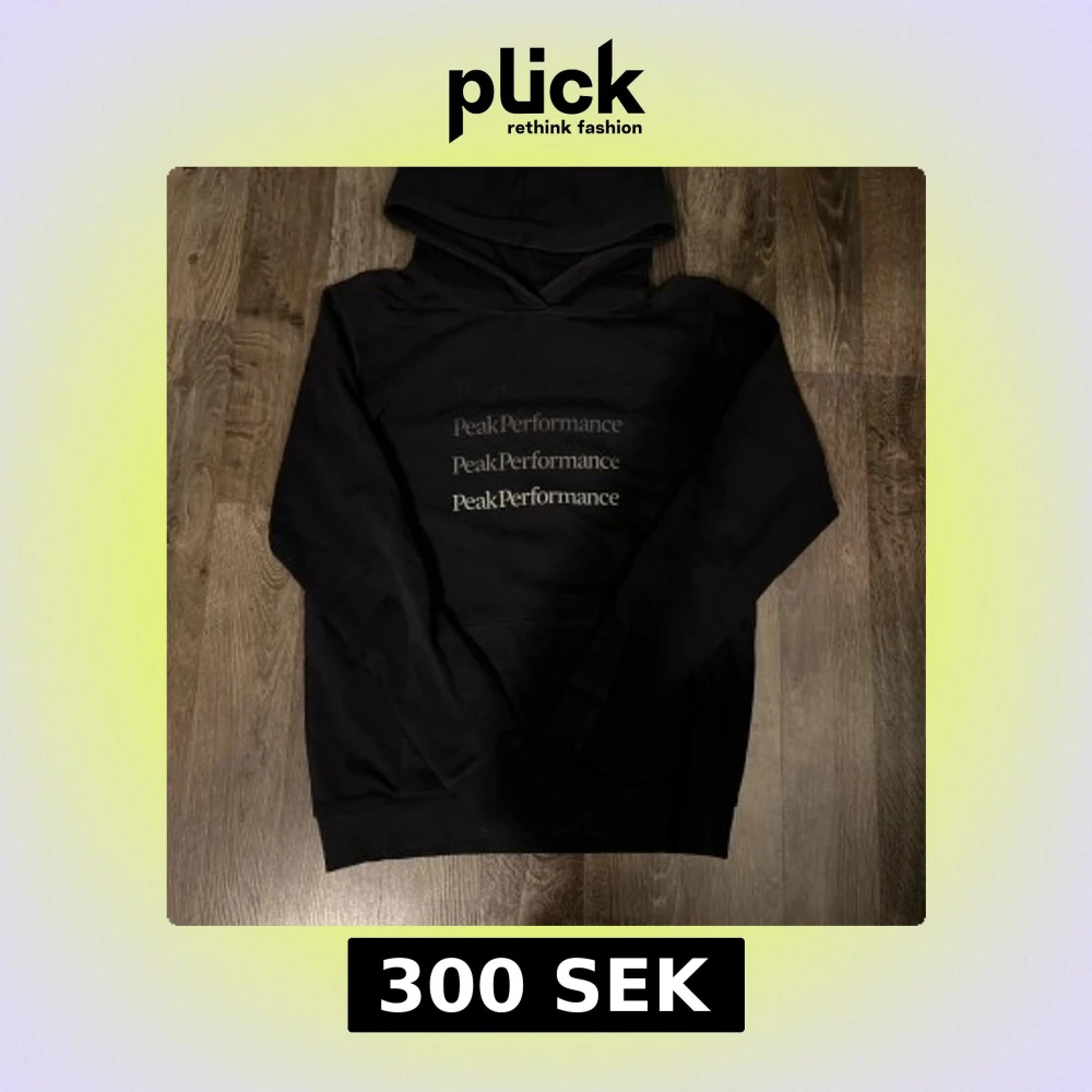 Svart hoodie från Peak Performance med tryckt logga i flera storlekar på bröstet. Klassisk modell med huva och långa ärmar, tillverkad i mjuk bomull.Den är dock lite solblekt men märks inte så mycket. Perfekt för en chill och stilren look.Den är i storlek 170cm som motsvara va S i vuxenstorlek.