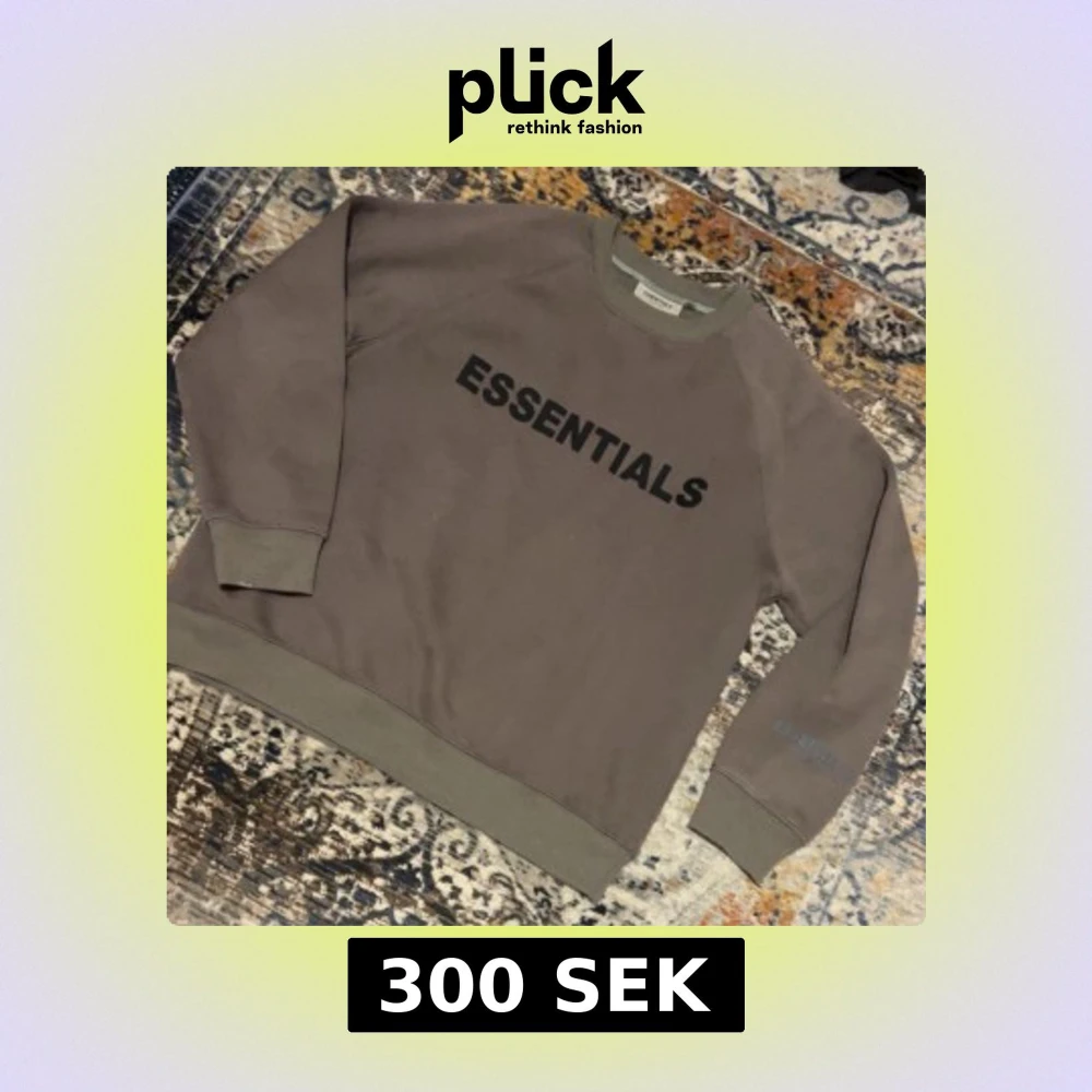 Säljer en brun sweatshirt från Essentials Fear of God med svart tryck på bröstet och ärmen. Tröjan har ribbade muddar vid hals, ärmslut och nederkant. Perfekt för dig som gillar streetwear och vill ha en clean look. Väldigt fint skick. Storlek Medium