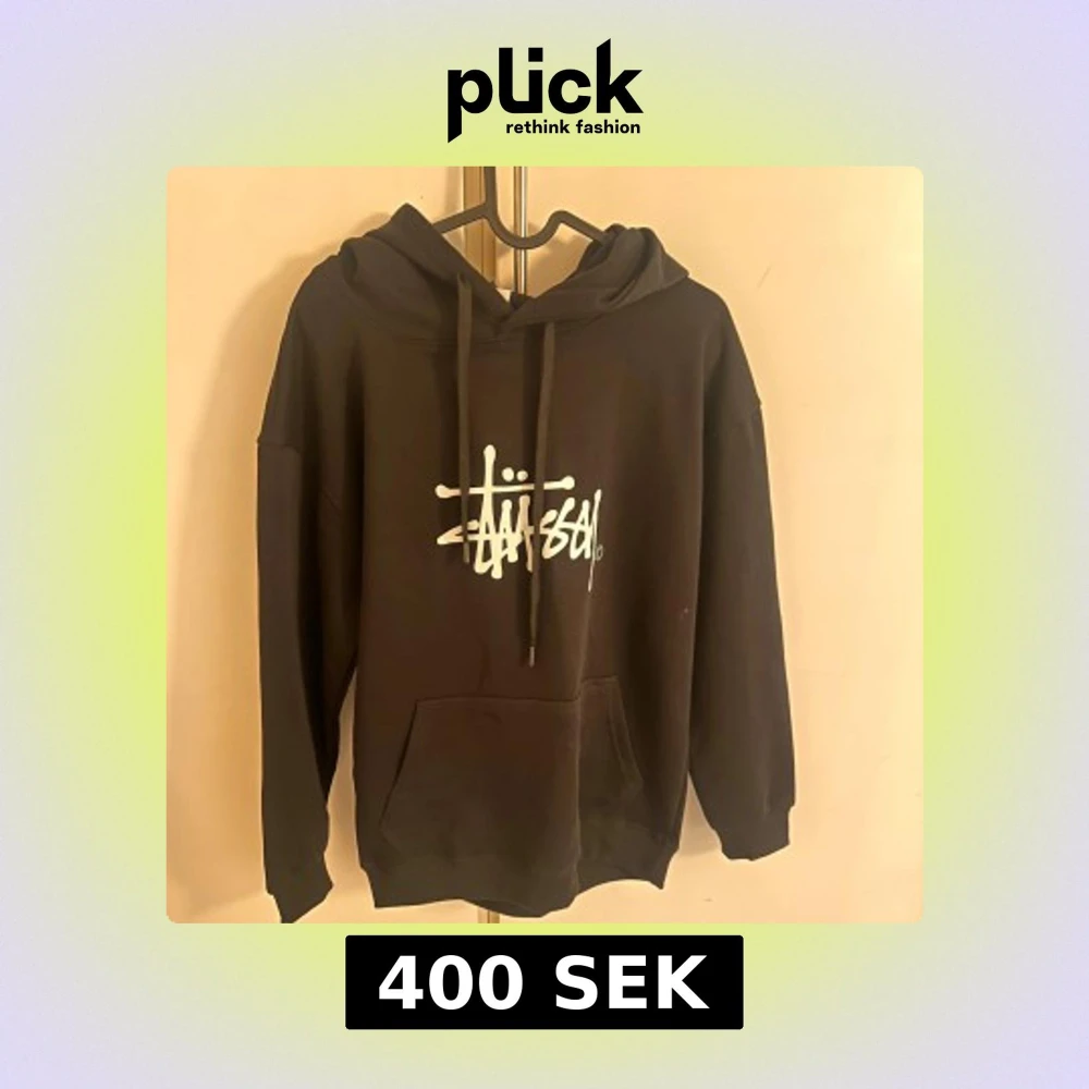 Svart hoodie från Stüssy med vit logotyp på bröstet och tryck på huvan. Ny pris ligger på ca 1400kr men säljer endast för 400kr!