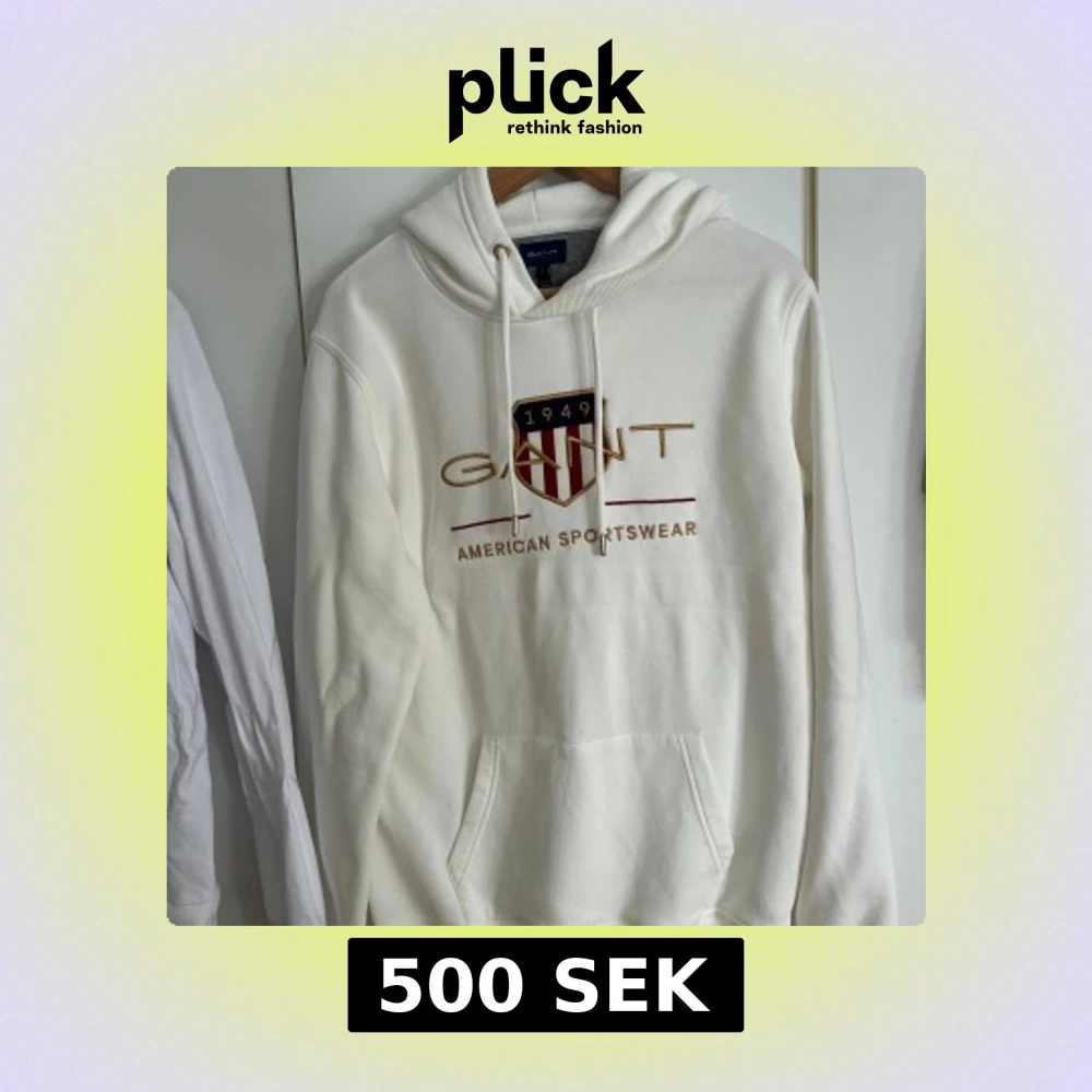 Vit hoodie från GANT med broderat emblem och text på bröstet. Tröjan har huva med snörning, känguruficka och ribbade muddar. Knappast använd.