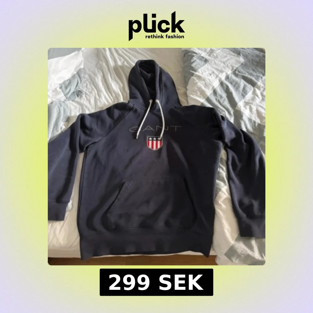 Säljer en mörkblå hoodie från GANT med vit snörning i huvan och klassiskt GANT-tryck samt sköld på bröstet. Tröjan har känguruficka framtill och är tillverkad i mjuk bomull. Perfekt för en avslappnad och stilren look.