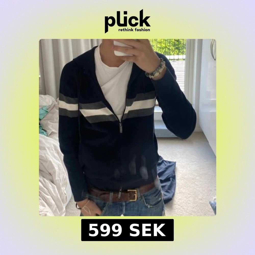 Säljer en marinblå hoodie med hel dragkedja och huva från Massimo dutti. Tröjan har två breda ränder i grått och vitt över bröstet och är långärmad. Perfekt för dig som gillar en sportig och avslappnad stil.