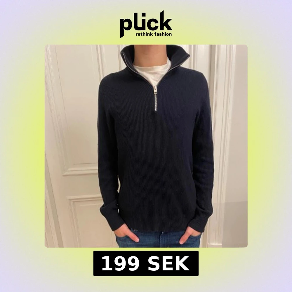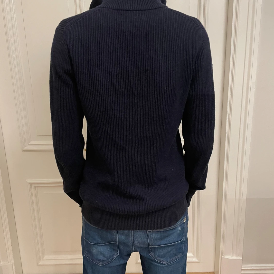 Mörkblå stickad tröja med ribbad struktur och hög krage med half zip-dragkedja. Långärmad modell med normal passform, perfekt för kyliga dagar. Enkel och stilren design som funkar till jeans eller chinos. Storleken är xs men är väldigt stor så passar M.