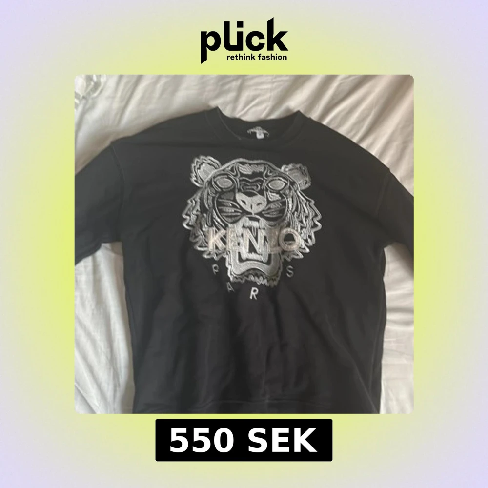 Svart sweatshirt från Kenzo med ikonisk silverbroderad tiger och logga på bröstet. Tröjan har rund hals, långa ärmar. Perfekt plagg för dig som vill sticka ut med stil. Inte den tjockaste materialet, och använt många gånger. Passar lite tajt på medium, alltså passar den small också!