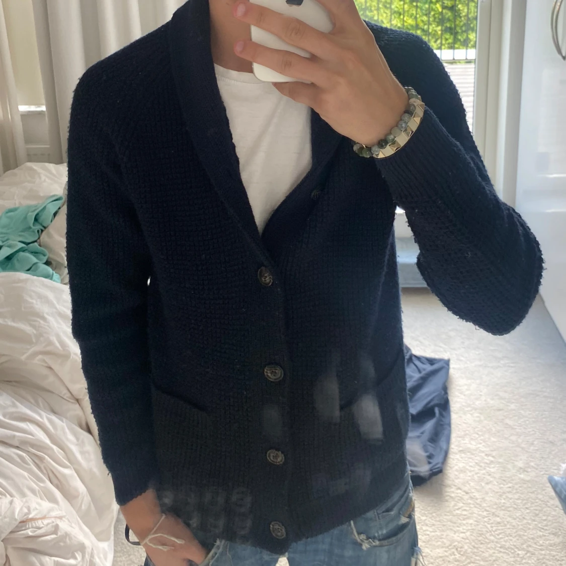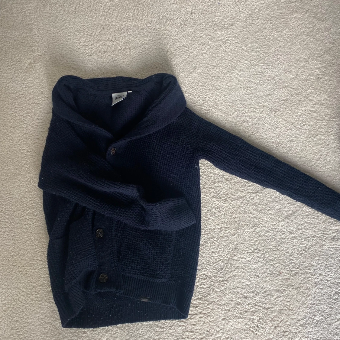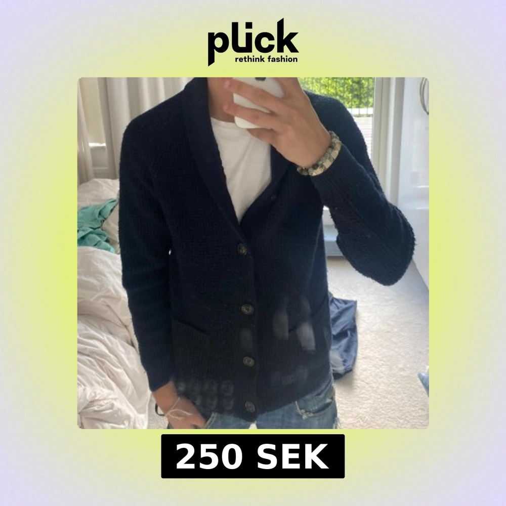 Säljer en mörkblå stickad kofta med grov struktur och snygg krage. Koftan har långa ärmar, knappar framtill och två praktiska fickor. Perfekt för dig som gillar klassisk och chill stil.