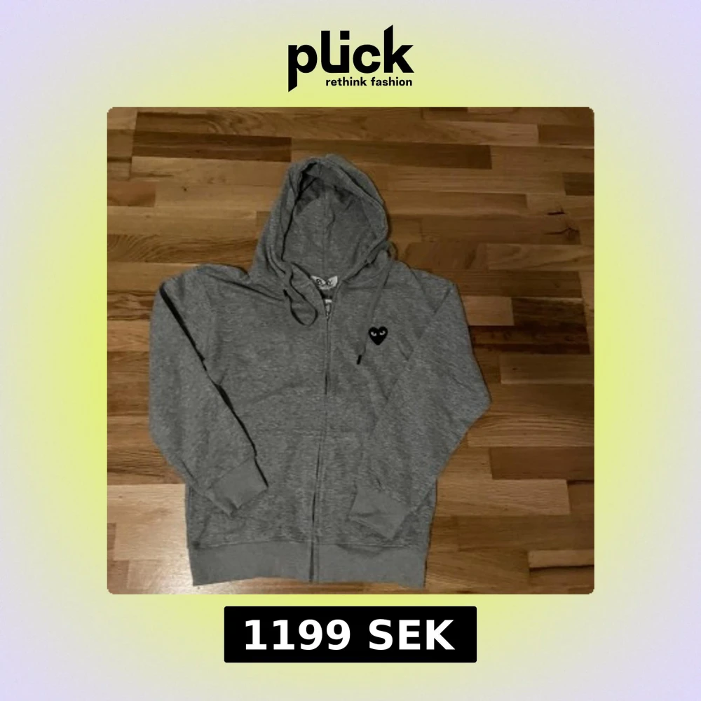 Grå hoodie med dragkedja från Comme des Garçons Play. Tröjan har huva med snörning, svart hjärta med ögon på bröstet och stort svart hjärta med ögon på ryggen. Tillverkad i mjuk bomull och har långa ärmar samt ribbade muddar.