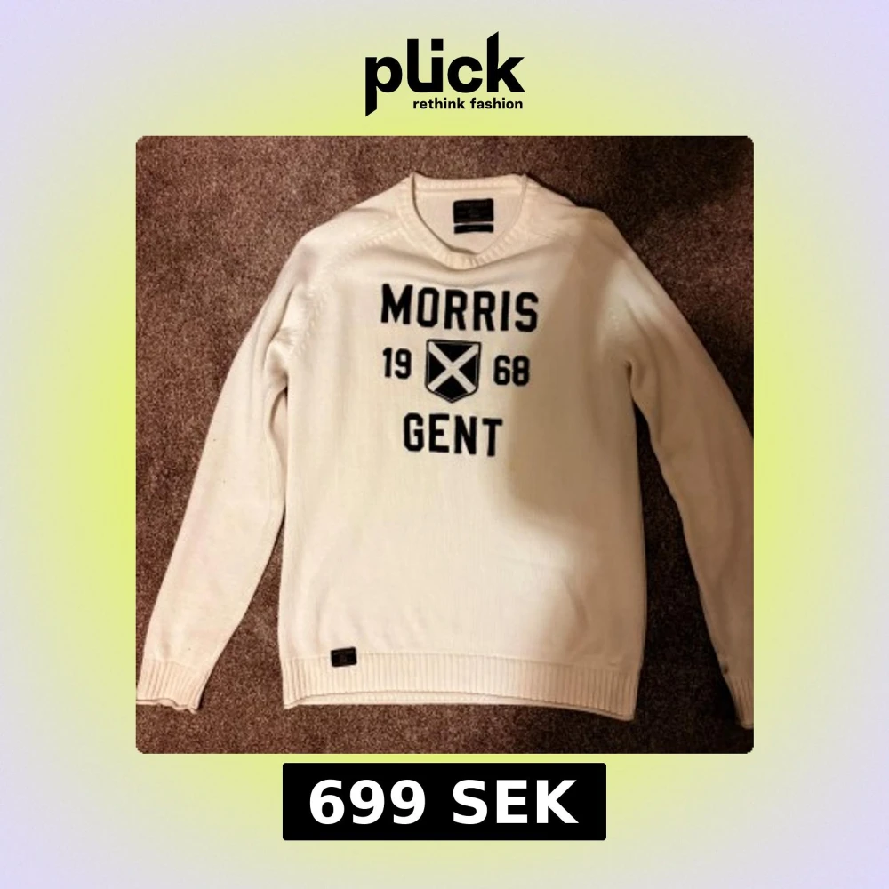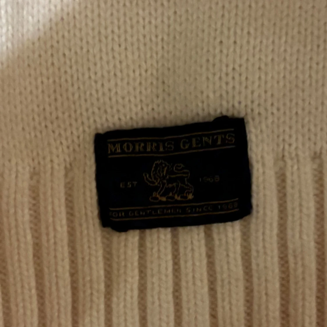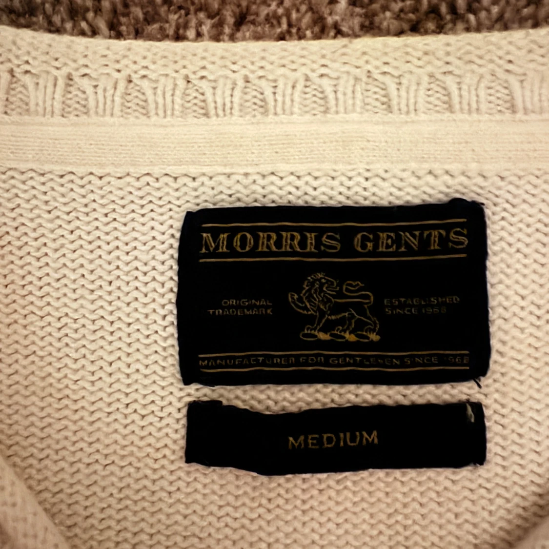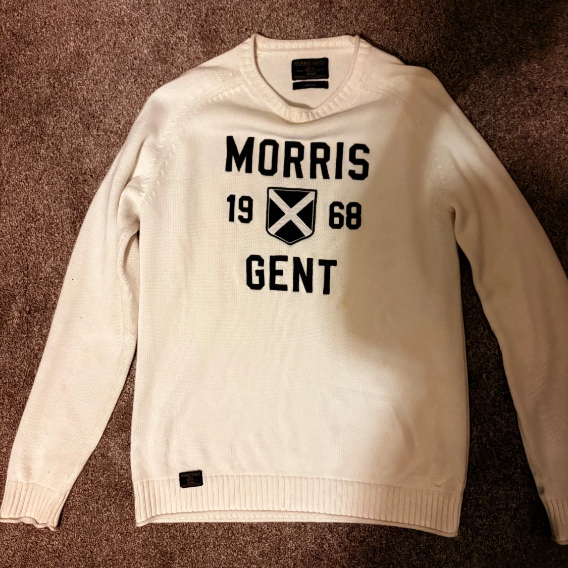 Snygg vit stickad tröja från Morris Gents i storlek medium. Tröjan har svart tryck med texten 'Morris Gent 1968' och ett emblem på bröstet. Klassisk rund halsringning och ribbade muddar vid ärmslut och nederkant. Perfekt för en stilren look. Hör av er vid minsta fundering