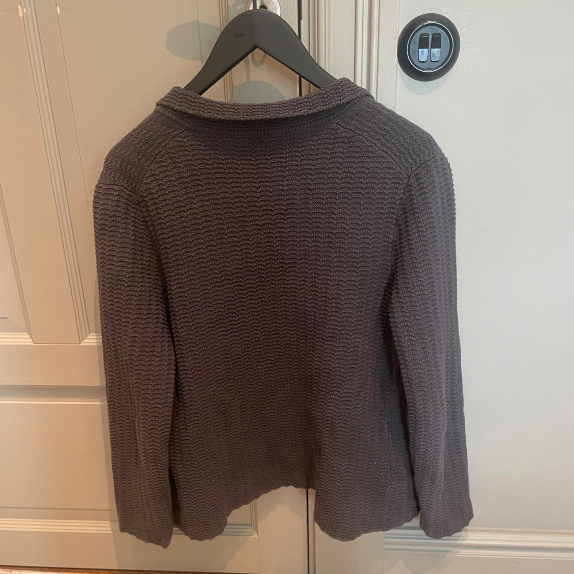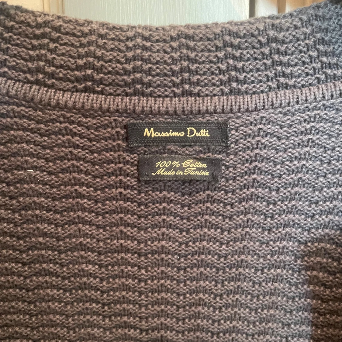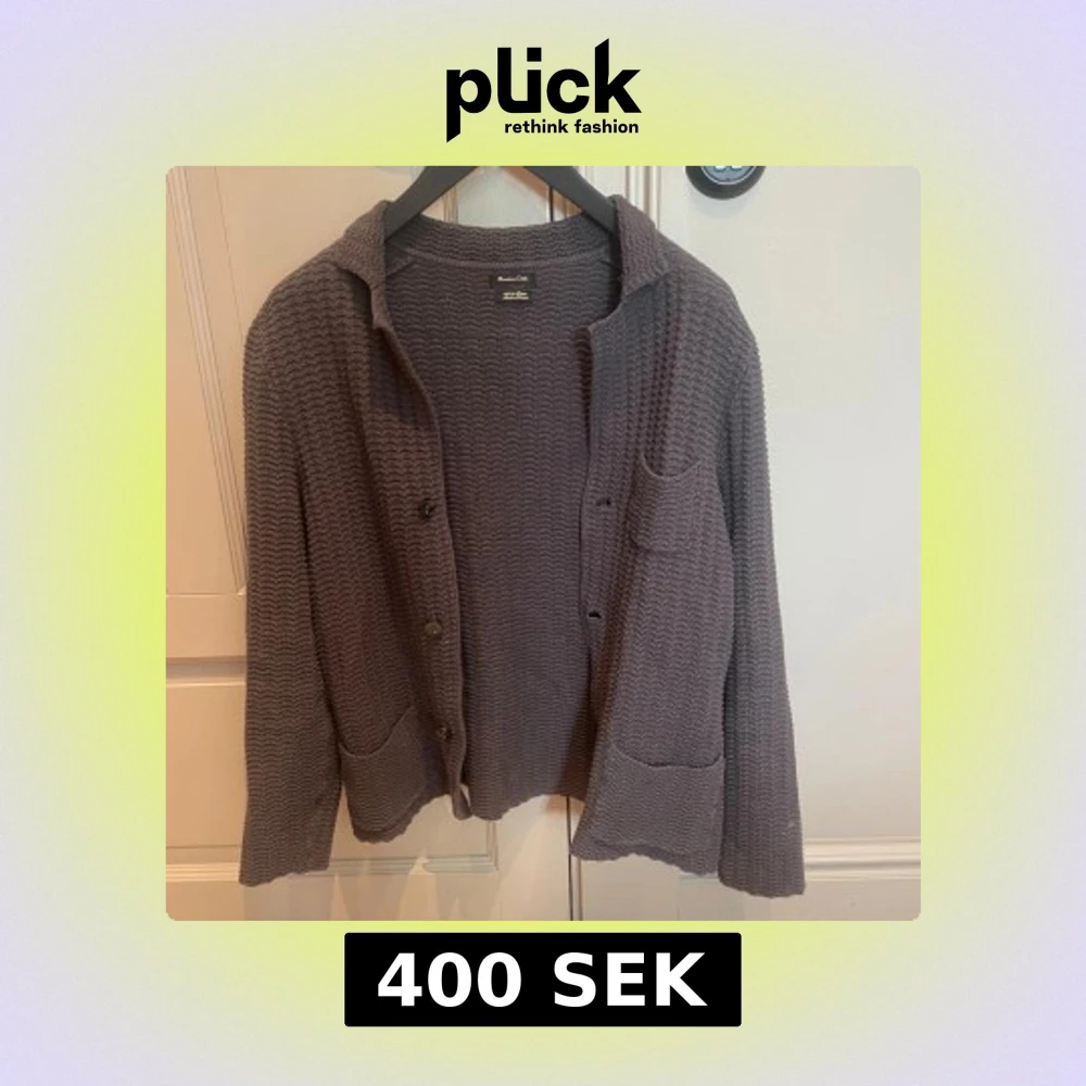 Storlek L men passar M. Säljer en grå kofta från Massimo Dutti i 100% bomull. Koftan har ett vågigt stickat mönster, knappar framtill, två fickor och lång ärm. Perfekt för lager-på-lager och chill stil.