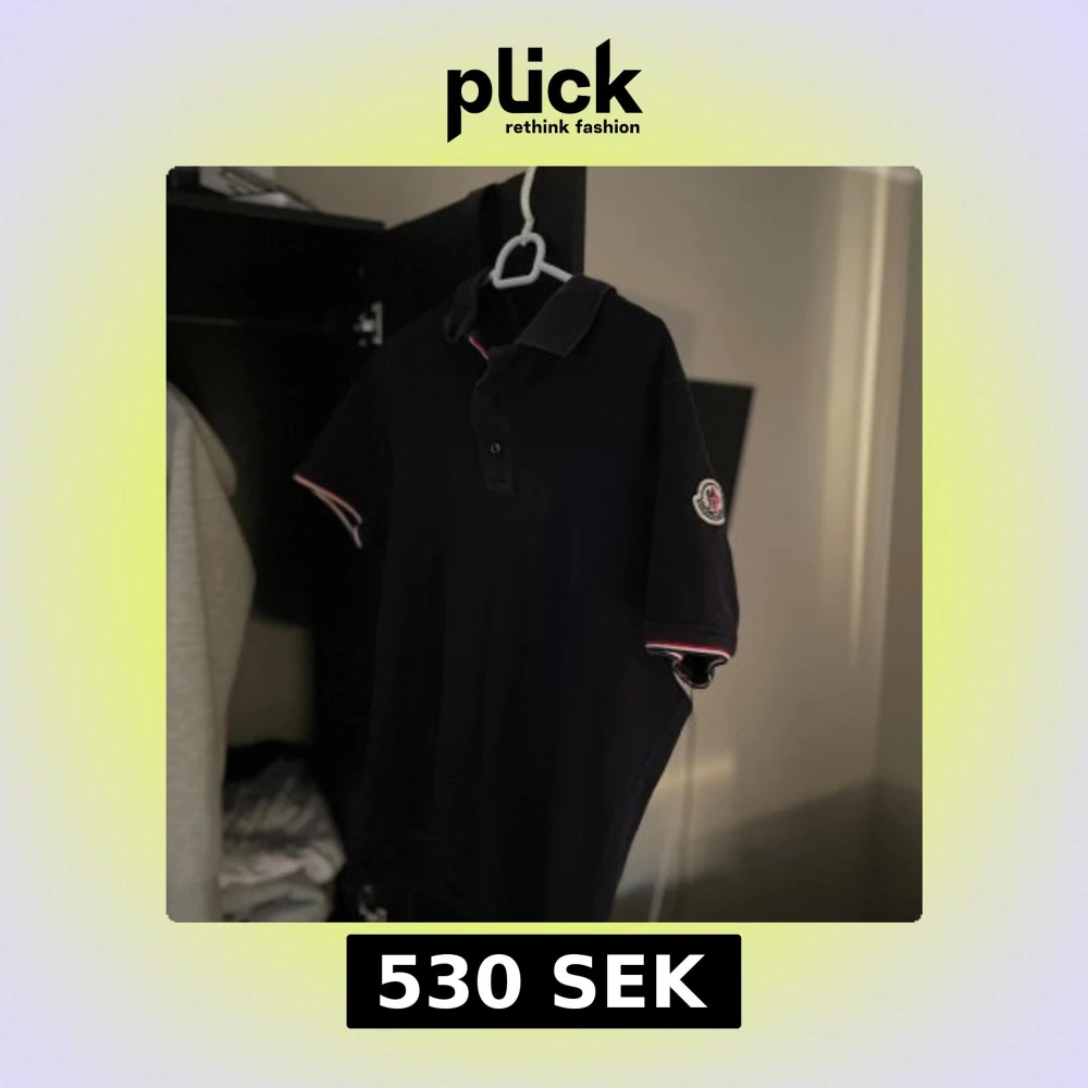 Svart pikétröja från Moncler med klassisk krage och två knappar framtill. Ärmarna har snygga rödvita detaljer och Moncler-logga på vänster ärm. Pris kan såklart diskuteras✅