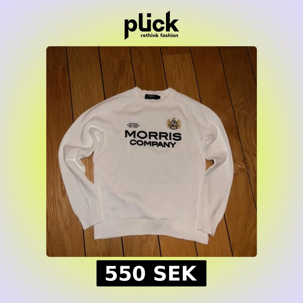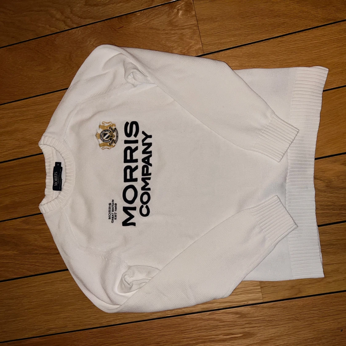 Snygg vit tröja från Morris med svart text 'Morris Company' på framsidan och ett broderat emblem. Tröjan har långa ärmar och ribbade muddar vid ärmslut och nederkant. Perfekt för en stilren look. Tröjan är i nytt skick, nypris - 1400kr